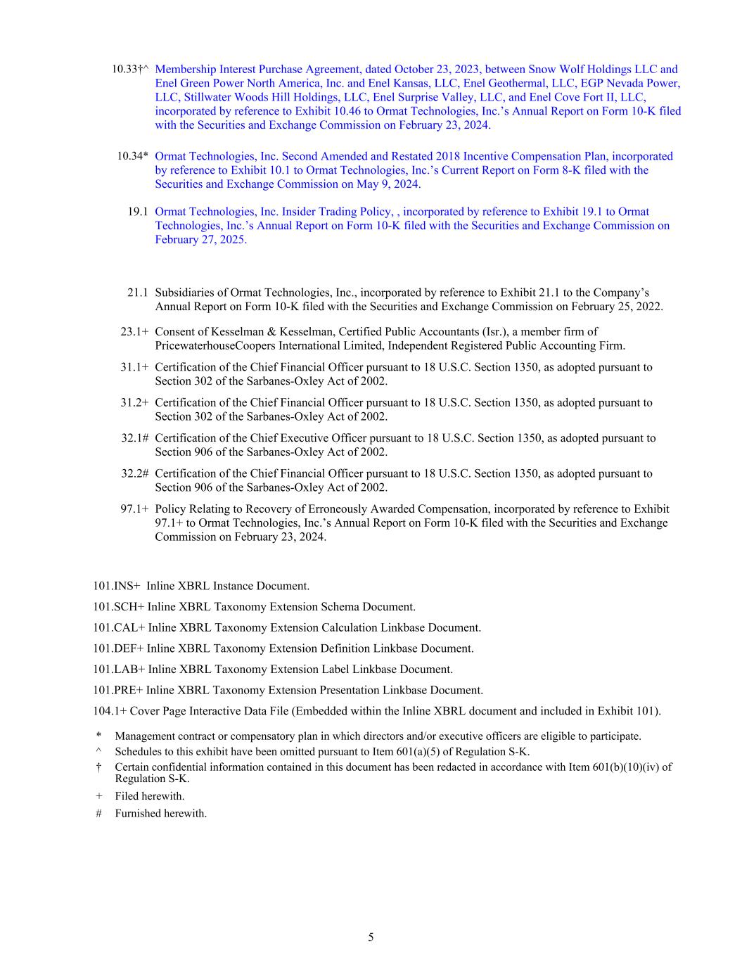 10.33 † ^ Snow Wolf Holdings LLC和Enel Green Power North America,Inc.与Enel Kansas,LLC、Enel Geothermal,LLC、EGP Nevada Power,LLC、Stillwater Woods Hill Holdings,LLC、Enel Surprise Valley,LLC和Enel Cove Fort II,LLC于2023年10月23日签订的会员权益购买协议,该协议通过引用Ormat Technologies, Inc.于2024年2月23日向美国证券交易委员会提交的10-K表格年度报告的方式并入附件 10.46。10.34*Ormat Technologies, Inc.第二次修订和重述的2018年激励薪酬计划,通过引用附件 10.1并入Ormat Technologies, Inc.于2024年5月9日向美国证券交易委员会提交的表格8-K的当前报告。19.1 Ormat Technologies, Inc.内幕交易政策,通过引用附件 19.1并入Ormat Technologies, Inc.于2025年2月27日向美国证券交易委员会提交的10-K表格年度报告。21.1 Ormat Technologies, Inc.的子公司,通过引用附件 21.1并入公司于2022年2月25日向美国证券交易委员会提交的10-K表格年度报告。23.1 + Kesselman & Kesselman同意,注册会计师(ISR.),罗兵咸永道国际有限公司成员所,独立注册会计师事务所。31.1 +根据18 U.S.C.第1350条对首席财务官进行的认证,该认证是根据2002年《萨班斯-奥克斯利法案》第302条通过的。31.2 +根据18 U.S.C.第1350条对首席财务官进行的认证,该认证是根据2002年《萨班斯-奥克斯利法案》第302条通过的。32.1 #根据18 U.S.C.第1350条对首席执行官进行认证,根据2002年《萨班斯-奥克斯利法案》第906条通过。32.2 #根据2002年《萨班斯-奥克斯利法案》第906条通过的18 U.S.C.第1350条对首席财务官进行认证。97.1 +与追回错误授予的赔偿有关的政策,通过引用附件 97.1 +并入Ormat Technologies, Inc.于2024年2月23日向美国证券交易委员会提交的10-K表格年度报告。101.INS +内联XBRL实例文档。101.SCH +内联XBRL分类扩展架构文档。101.CAL +内联XBRL分类学扩展计算linkbase文档。101.DEF +内联XBRL分类学扩展定义linkbase文档。101.LAB +内联XBRL分类学扩展标签linkbase文档。101.PRE +内联XBRL分类学扩展演示linkbase文档。104.1 +封面页交互式数据文件(嵌入内联XBRL文档中,包含在附件 101中)。*董事和/或执行官有资格参与的管理合同或补偿计划。^根据S-K条例第601(a)(5)项,本展览的附表已被省略。↓本文件所载的某些机密资料已根据S-K条例第601(b)(10)(iv)项进行了编辑。+随函提交。#随函附上。5