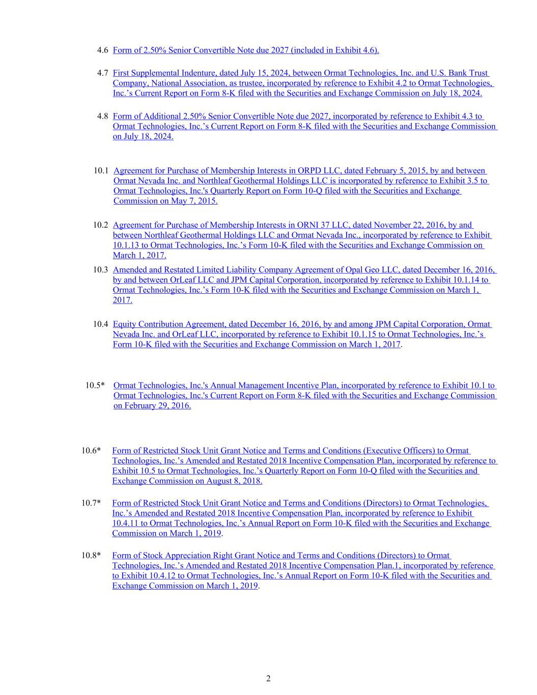 4.6 2027年到期的2.50%优先可转换票据的表格(包含在附件 4.6中)。4.7第一份补充契约,日期为2024年7月15日,由奥玛特科技,Inc.和作为受托人的美国银行信托公司,National Association签署,通过引用附件 4.2并入Ormat Technologies, Inc.于2024年7月18日向美国证券交易委员会提交的关于表格8-K的当前报告。4.8 2027年到期的额外2.50%优先可转换票据的表格,通过引用附件 4.3并入Ormat Technologies, Inc.于2024年7月18日向美国证券交易委员会提交的关于表格8-K的当前报告。10.1 Ormat Nevada Inc.和Northleaf Geothermal Holdings LLC于2015年2月5日签订的购买ORPD LLC会员权益的协议通过引用附件 3.5并入Ormat Technologies, Inc.于2015年5月7日向美国证券交易委员会提交的表格10-Q的季度报告。10.2 Northleaf Geothermal Holdings LLC和Ormat Nevada Inc.于2016年11月22日签订的购买ORNI 37 LLC会员权益的协议,该协议通过引用附件 10.1.13并入Ormat Technologies, Inc.于2017年3月1日向美国证券交易委员会提交的10-K表格。10.3 Orleaf LLC和JPM Capital Corporation于2016年12月16日修订并重述了Opal Geo LLC的有限责任公司协议,该协议由Orleaf LLC和JPM Capital Corporation通过引用附件 10.1.14并入Ormat Technologies, Inc.于2017年3月1日向美国证券交易委员会提交的10-K表格。10.4 JPM Capital Corporation、Ormat Nevada Inc.和OrLeaf LLC于2016年12月16日签署的股权出资协议,该协议通过引用附件 10.1.15并入Ormat Technologies, Inc.于2017年3月1日向美国证券交易委员会提交的10-K表格。10.5*Ormat Technologies, Inc.的年度管理层激励计划,通过引用附件 10.1并入Ormat Technologies, Inc.于2016年2月29日向美国证券交易委员会提交的表格8-K的当前报告。10.6*向Ormat Technologies, Inc.修订和重述的2018年激励薪酬计划的限制性股票授予通知表格以及条款和条件(执行官),该表格通过引用Ormat Technologies, Inc.于2018年8月8日以表格10-Q提交给证券交易委员会的季度报告的方式并入TERM3。10.7*将限制性股票授予通知表格以及条款和条件(董事)授予Ormat Technologies, Inc.经修订和重述的2018年激励薪酬计划,该表格已通过引用附件 10.4.11并入Ormat Technologies, Inc.于2019年3月1日向美国证券交易委员会提交的表格10-K的年度报告。10.8*将股票增值权授予通知表格以及条款和条件(董事)授予Ormat Technologies, Inc.经修订和重述的2018年激励薪酬计划1,该表格通过引用附件 10.4.12并入Ormat Technologies, Inc.于2019年3月1日向美国证券交易委员会提交的10-K表格年度报告。2