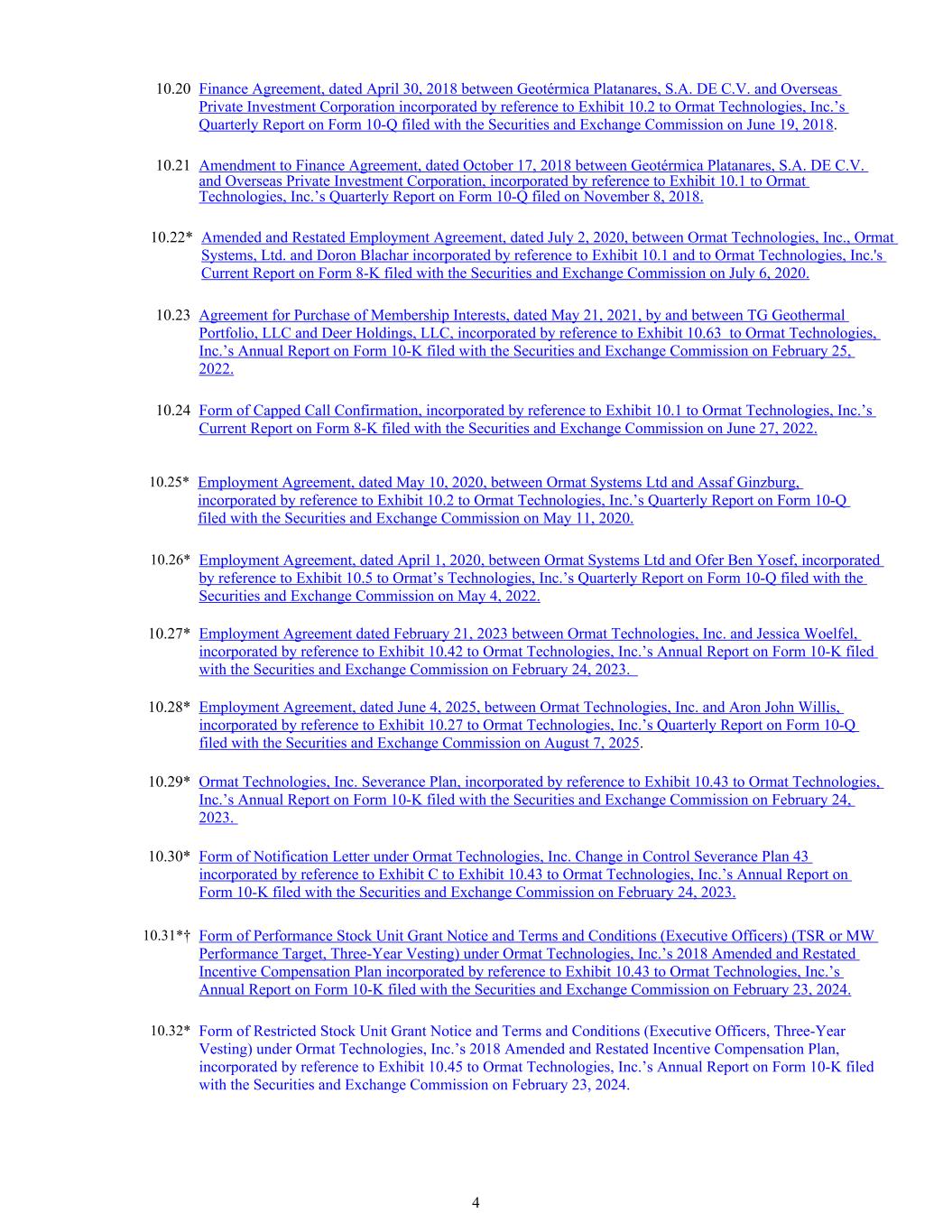 10.20《财务协议》,日期为2018年4月30日,由Geot é rmica Platanares,S.A. DEC.V.和Overseas Private Investment Corporation签订,该协议通过引用将附件 10.2并入Ormat Technologies, Inc.于2018年6月19日向美国证券交易委员会提交的表格10-Q的季度报告。10.21 Geot é rmica Platanares,S.A. DE C.V.和Overseas Private Investment Corporation于2018年10月17日对融资协议进行的修订,通过引用附件 10.1并入Ormat Technologies, Inc.于2018年11月8日提交的10-Q表格季度报告。10.22*Ormat Technologies, Inc.、Ormat Systems,Ltd.和Doron Blachar之间日期为2020年7月2日的经修订和重述的雇佣协议,这些协议通过引用附件 10.1和Ormat Technologies, Inc.于2020年7月6日向美国证券交易委员会提交的关于表格8-K的当前报告并入。10.23 TG Geothermal Portfolio,LLC和Deer Holdings,LLC于2021年5月21日签订的购买会员权益协议,该协议通过引用将附件 10.63并入Ormat Technologies, Inc.于2022年2月25日向美国证券交易委员会提交的10-K表格年度报告。10.24有上限的看涨确认表格,通过引用附件 10.1并入Ormat Technologies, Inc.于2022年6月27日向美国证券交易委员会提交的关于表格8-K的当前报告。10.25*Ormat Systems Ltd与Assaf Ginzburg于2020年5月10日签订的雇佣协议,该协议通过引用附件 10.2至Ormat Technologies, Inc.于2020年5月11日向美国证券交易委员会提交的表格10-Q的季度报告中的TERM1 10.2并入。10.26*Ormat Systems Ltd与Ofer Ben Yosef于2020年4月1日签订的雇佣协议,该协议通过引用附件 10.5并入Ormat’s Technologies,Inc.于2022年5月4日向美国证券交易委员会提交的10-Q表格季度报告。10.27*奥玛特科技,Inc.与Jessica Woelfel于2023年2月21日签订的雇佣协议,通过引用附件 10.42并入Ormat Technologies, Inc.于2023年2月24日向美国证券交易委员会提交的10-K表格年度报告。10.28*奥玛特科技,Inc.与Aron John Willis于2025年6月4日签订的雇佣协议,通过引用附件 10.27并入Ormat Technologies, Inc.于2025年8月7日向美国证券交易委员会提交的10-Q表格季度报告。10.29*Ormat Technologies, Inc.遣散费计划,该遣散费计划通过引用附件 10.43并入Ormat Technologies, Inc.于2023年2月24日向美国证券交易委员会提交的10-K表格年度报告。10.30*根据Ormat Technologies, Inc.变更控制权解除计划43提交的通知函表格,该通知函通过引用附件 C至Ormat Technologies, Inc.于2023年2月24日向美国证券交易委员会提交的表格10-K的年度报告的TERM3至TERM3的TERM3的TERM3的TERM3表格10.43并入。10.31*↓根据Ormat Technologies, Inc. 2018年经修订和重述的激励薪酬计划,绩效股票单位授予通知以及条款和条件(执行官)(TSR或MW绩效目标,三年归属)的表格,该表格通过引用附件 10.43并入Ormat Technologies, Inc.于2024年2月23日向美国证券交易委员会提交的10-K表格年度报告。10.32*根据Ormat Technologies, Inc. 2018年经修订和重述的激励薪酬计划的限制性股票授予通知以及条款和条件(执行官,三年归属)的表格,该表格通过引用Ormat Technologies, Inc.于2024年2月23日向美国证券交易委员会提交的表格10-K的年度报告中纳入附件 10.45。4