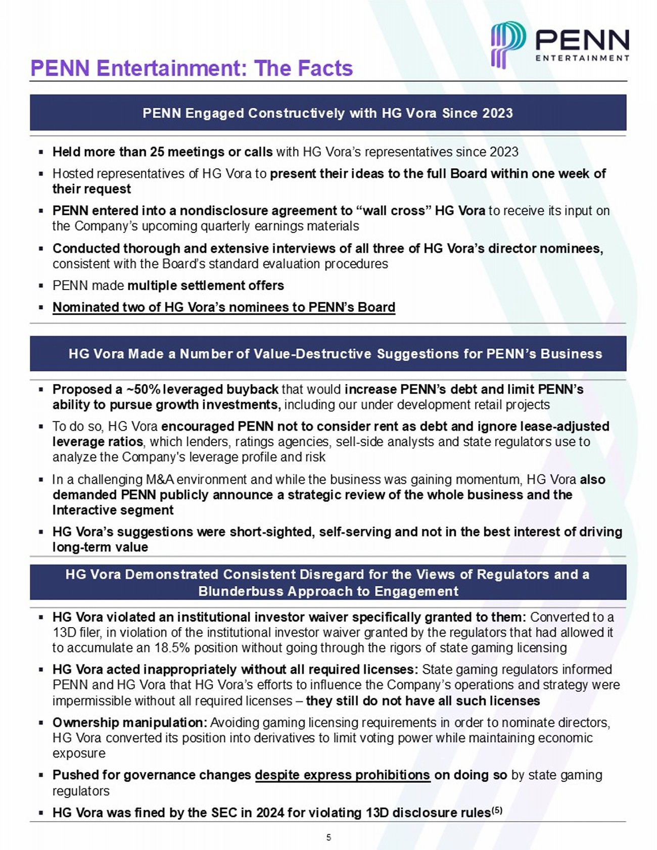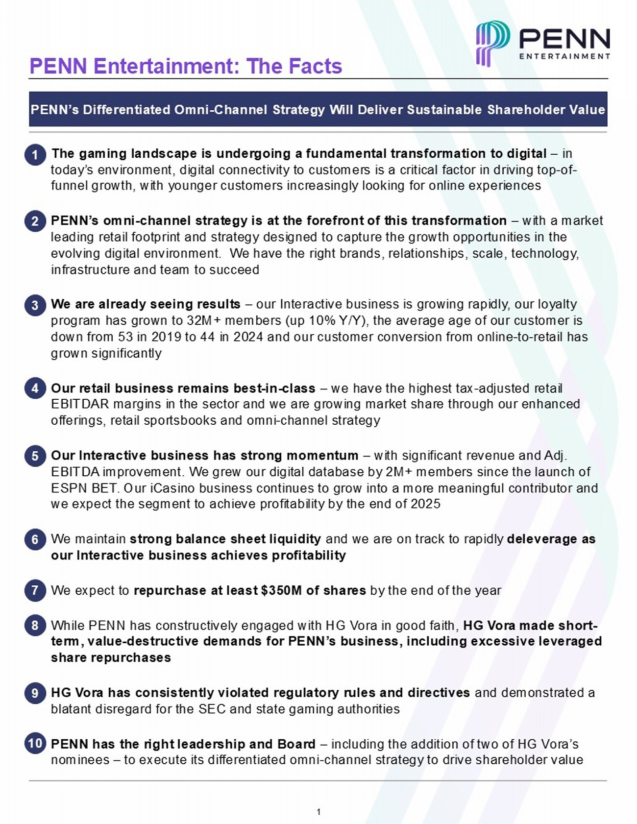 | · | 2025年1月,在HG Vora提名三名候选人进入PENN董事会后,我们迅速将这些候选人纳入了我们积极和持续的董事搜寻过程。董事会对每位HG Vora候选人进行了彻底和广泛的面试,符合我们的标准评估程序 |