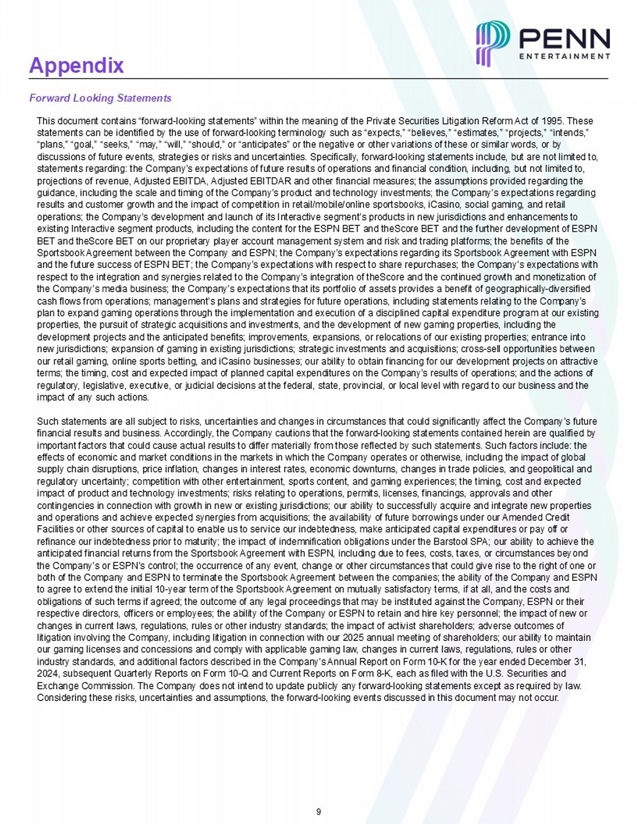 9附录前瞻性陈述本文件包含1995年《私人证券诉讼改革法案》含义内的“前瞻性陈述”。这些陈述可以通过使用前瞻性术语来识别,例如“预期”、“相信”、“估计”、“项目”、“打算”、“计划”、“目标”、“寻求”、“可能”、“将”、“应该”或“预期”或这些或类似w ord s的负面或其他变体,或通过对未来事件、战略或风险和不确定性的讨论。具体而言,前瞻性陈述包括但不限于以下方面的陈述:公司对未来经营业绩和财务状况的预期,包括但不限于对收入、调整后EBITDA、调整后EBITDA和其他财务指标的预测;就第E条指引提供的假设,包括公司产品和技术投资的规模和时间;公司对rega rdi ng业绩和客户增长的预期以及零售/移动/在线体育博彩、iCasino、社交游戏的竞争影响,和re tai l运营;公司在新的司法管辖区开发和推出其Interactive部门的产品以及对现有Interactive部门产品的增强,包括ESPN BET和theScore BET的内容以及ES PN BET和theScore BET在我们专有的球员账户管理系统和风险和交易平台上的进一步发展;公司与ESPN之间的体育博彩协议的好处;公司对其与ESPN的体育博彩协议的期望以及ESPN BET未来的成功;公司对股份回购的期望;公司对与公司整合theScore和持续增长相关的整合和协同效应的期望和公司媒体业务的moneti zat ion;公司对其资产组合提供地理上的好处的预期--来自运营的多样化现金流;管理层对未来运营的计划和战略,包括与Com pan y计划通过在我们的现有物业实施和执行有纪律的资本支出计划扩大博彩业务、寻求战略收购和投资以及开发新的博彩物业(包括th e开发项目和预期收益)有关的声明;改进、扩展,或搬迁我们现有的物业;进入新的司法管辖区;在现有司法管辖区扩大博彩业务;战略投资和收购;我们的零售博彩、在线体育博彩和iCasino业务之间的交叉销售机会;我们为我们的开发项目以有吸引力的条款获得融资的能力;计划资本支出对公司经营业绩的时间、成本和预期影响;以及联邦、州、省的监管、立法、行政或司法决定的CTI,或地方一级与你r b业务和任何此类行动的影响有关。这类报表都受制于风险、不确定性和情况变化,这些风险、不确定性和情况变化可能会对公司未来的财务业绩和业务产生重大影响。因此,该公司告诫说,此处包含的前瞻性陈述受到可能导致实际结果与此类陈述所反映的结果存在重大差异的重要因素的限制。此类因素包括:公司经营所在市场的经济和市场状况或其他方面的影响,包括glo bal供应链中断、价格通胀、利率变化、经济衰退、贸易政策变化以及地缘政治和监管不确定性的影响;与其他娱乐、体育内容和游戏体验的竞争;产品和技术投资的时机、成本和ex pec ted影响;与运营、许可、许可、融资有关的风险,与新的或现有司法管辖区的增长相关的批准和其他或有事项;我们成功收购和整合新的物业和业务并从收购中实现预期协同效应的能力;我们经修订的Cred IT设施或其他资本来源下未来借款的可用性,以使我们能够偿还债务、进行预期的资本支出或支付f或在到期前为我们的债务再融资;Barstool SPA下的赔偿义务的影响;我们的能力从与ESPN的体育博彩协议中获得预期的财务回报,包括由于费用,成本、税收或情况取决于公司或ESPN的控制权;任何事件的发生, 可能导致公司与ESPN一方或双方有权终止两家公司之间的《体育博彩协议》的变更或其他情况;公司与ESPN有能力同意以双方都满意的条款(如果有的话)延长《体育博彩协议》最初10年的期限,以及如果同意这些条款的费用和义务;可能对公司、ESPN或EIR各自董事提起的任何法律诉讼的结果,高级职员或雇员;公司或ESPN保留和雇用关键人员的能力;现行法律、法规、规则或其他行业标准的新的或变化的影响;维权股东的影响;不利结果涉及公司的诉讼,包括与我们的2025年年度股东大会有关的诉讼;我们的能力维持我们的博彩牌照和特许权,并遵守适用的博彩法、现行法律、法规、规则或其他行业标准的变化,以及公司截至2024年12月31日止年度的10-K表格年度报告、随后的10-Q表格季度报告和8-K表格当前报告中描述的其他因素,每一份报告均已提交给美国证券交易委员会。除法律要求外,公司不打算公开更新任何前瞻性陈述。考虑到这些风险、不确定性和假设,本文件中讨论的前瞻性事件可能不会发生。