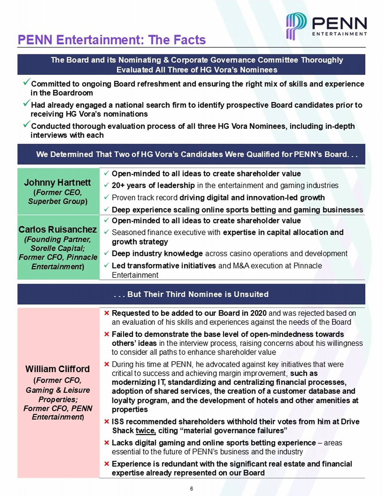 5▪自2023年以来与HG Vora的代表举行了超过25次会议或通话▪接待了HG Vora的代表,在他们提出要求后的一周内向全体董事会提出了他们的想法▪PENN与HG Vora签订保密协议,以接收其对公司即将发布的季度收益材料的投入▪对HG Vora的所有三位董事提名人进行了彻底和广泛的采访,符合委员会的标准评估程序▪PENN提出多个和解提议▪提名HG Vora的两位被提名人进入PENN董事会佩恩国民博彩:事实PENN自2023年以来与HG Vora进行了建设性的合作▪提议进行约50%的杠杆回购,这将增加PENN的债务并限制PENN追求增长投资的能力,包括我们正在开发的零售项目▪为了做到这一点,HG Vora鼓励PENN忽略租赁调整后的杠杆比率,贷方、评级机构、卖方分析师和州监管机构用来分析公司的杠杆状况和风险▪在充满挑战的并购环境中,在业务增长势头强劲的同时,HG Vora还要求PENN公开宣布对整个业务和互动部门进行战略审查▪HG Vora的建议是短视的,自我服务并不符合推动长期价值的最佳利益HG Vora对PENN的业务提出了多项价值-破坏性建议▪HG Vora违反了专门授予他们的一项机构投资者豁免:转换为13D申报人,违反监管机构授予的机构投资者豁免,允许其在未经过严格的国家博彩许可的情况下累计18.5%的头寸▪HG Vora在没有所有必要许可的情况下采取了不当行为:州博彩监管机构告知PENN和HG Vora,HG Vora在没有所有必要许可的情况下影响公司运营和战略的努力是不允许的——他们仍然没有所有此类许可▪所有权操纵:为了提名董事而避免博彩许可要求,HG Vora将其头寸转换为衍生品以限制投票权,同时保持经济敞口▪尽管州博彩监管机构明文禁止这样做,但仍推动治理变革▪HG Vora因违反13D披露规则于2024年被SEC罚款(5)HG Vora表现出始终如一的无视监管机构的意见和愚蠢的参与方式
