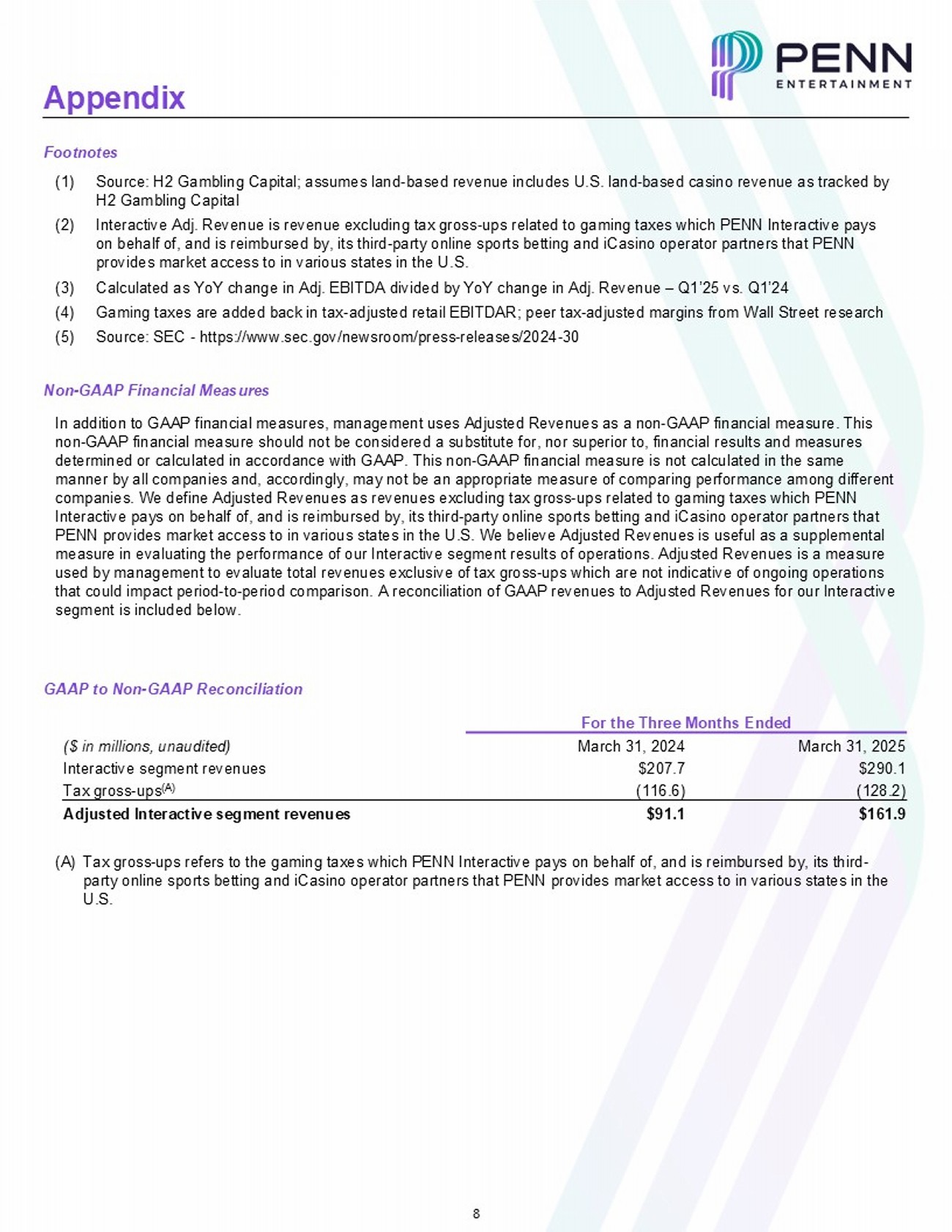 8附录脚注(1)来源:H2 Gambling Capital;假设陆上收入包括H2 Gambling Capital跟踪的美国陆上赌场收入(2)Interactive Adj.收入是PENN Interactive代表支付的与博彩税相关的不含税毛额收入,由以下人员报销,PENN在美国各州提供市场准入的第三方在线体育博彩和iCasino运营商合作伙伴(3)计算方法为Adj的同比变化。EBITDA除以Adj的同比变化。收入– 25年第一季度与24年第一季度(4)博彩税在税收调整后的零售EBITDA中加回;同行税收-华尔街研究的调整后利润率(5)来源:SEC-https://www.sec.gov/newsroom/press-releases/2024-30非GAAP财务指标除了GAAP财务指标外,管理层还使用调整后的收入作为非GAAP财务指标。这种非GAAP财务指标不应被视为替代或优于根据GAAP确定或计算的财务结果和指标。这种非GAAP财务指标并非所有公司都以相同的方式计算,因此,可能不是不同公司之间比较业绩的适当衡量标准。我们将调整后的收入定义为不包括与博彩税相关的税收总额的收入,PENN Interactive代表PENN在美国各州提供市场准入的第三方在线体育博彩和iCasino运营商合作伙伴支付并由其报销。我们认为,调整后的收入作为评估我们互动部门运营结果表现的补充衡量标准是有用的。调整后的收入是管理层用来评估总收入的一种衡量标准,不包括税收总额,这并不表示可能影响期间比较的持续运营。下文列出了我们互动部门的GAAP收入与调整后收入的对账。截至2025年3月31日止三个月的GAAP与非GAAP对账情况2024年3月31日(百万美元,未经审计)290.1美元207.7美元互动部门收入(128.2)(116.6)税收毛额(a)161.9美元91.1美元调整后互动部门收入(a)税收毛额是指PENN Interactive代表PENN在美国各州提供市场准入的第三方在线体育博彩和iCasino运营商合作伙伴支付并由其偿还的博彩税。