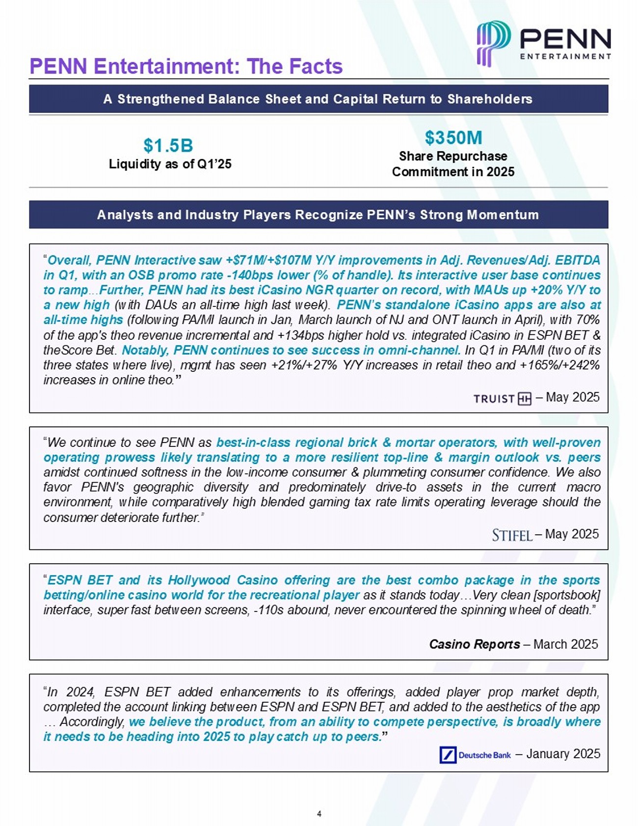 4 佩恩国民博彩:事实加强了资产负债表和资本回报给股东的1.5B美元流动性截至2025年第一季度3.5亿美元的股票回购承诺分析师和行业参与者认可PENN的强劲势头“ESPN BET及其好莱坞赌场产品对于当今的休闲玩家来说,是体育博彩/在线赌场世界中最好的组合套餐……非常干净的[ sportsbook ]界面,屏幕之间的速度超级快,-110的比比皆是,从未遇到过死亡的纺车。”《赌场报告– 2025年3月》“2024年,ESPN BET对其产品进行了增强,增加了球员道具市场深度,完成了ESPN和ESPN BET之间的账户链接,并增加了应用程序的美感……因此,我们认为,从竞争能力的角度来看,该产品在很大程度上是它进入2025年所需要的地方,以赶上同行。”– 2025年1月“我们继续认为PENN是同类最佳的区域实体实体运营商,在低收入消费者持续疲软和消费者信心暴跌的情况下,经过充分验证的运营能力可能会转化为与同行相比更具弹性的顶线和利润率前景。我们还倾向于PENN的地域多样性,在当前的宏观环境下主要是drive-to资产,而如果消费者进一步恶化,相对较高的混合博彩税率将限制经营杠杆。”– 2025年5月“总体而言,PENN Interactive在第一季度的Adj. Revenues/Adj. EBITDA同比增长+ 7100万美元/+ 1.07亿美元,OSB促销率-低140个基点(拉手%)。其互动用户群持续攀升..。此外,PENN创下有记录以来最好的iCasino NGR季度,MAU同比增长+ 20%至新高(上周DAU创历史新高)。PENN的独立iCasino应用程序也处于历史最高水平(继1月推出PA/MI、3月推出NJ和4月推出ONT之后),该应用程序的theo收入增量为70%,与ESPN BET & theScore Bet中的集成iCasino相比,该应用程序的持有量增加了+ 134个基点。值得注意的是,PENN继续在全渠道取得成功。在PA/MI(live的三个州中的两个)的第一季度,mGMT的零售theo同比增长+ 21%/+ 27%,在线theo同比增长+ 165%/+ 242%。”– 2025年5月