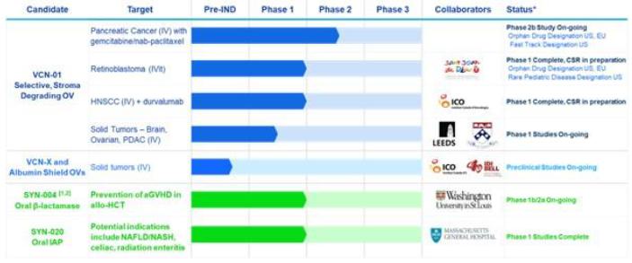 在收购之前,我们的重点是开发旨在治疗胃肠道(GI)疾病的疗法,其中包括我们的临床开发候选者:(1)SYN-004(ribaxamase),旨在降解胃肠道内某些常用的静脉注射(IV)β-内酰胺类抗生素,以防止微生物组损伤,从而防止艰难梭菌感染(CDI)和耐万古霉素肠球菌(VRE)等致病菌的过度生长和感染,并降低异基因造血细胞移植(HCT)受者急性移植物抗宿主病(AGVHD)的发生率和严重程度,以及(2)SYN-020,一种在cGMP条件下生产的酶肠道碱性磷酸酶(IAP)的重组口服制剂,旨在治疗局部胃肠道和全身疾病。作为我们向专注于肿瘤学的公司战略转型的一部分,我们正在探索为我们的SYN-004和SYN-020资产创造价值的选择,包括外包许可或合作。