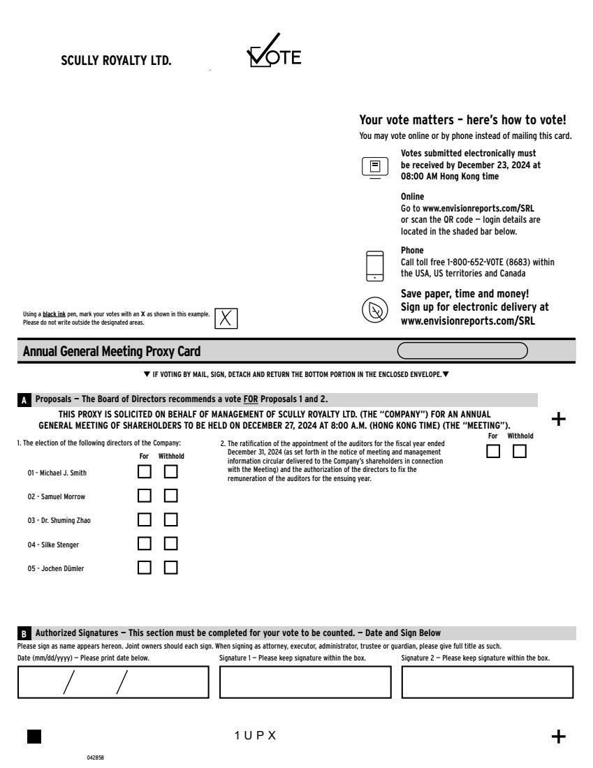 本次代理是代表SCULLY ROYALTY LTD.(“公司”)管理层就将于2024年12月27日召开的年度股东大会(“会议”)征集的。下列签署人,即公司在册股东,现指定Michael Smith或其未通过,Samuel Morrow,或代替其担任代理持有人,并有替代权力,出席会议以及在会议的任何休会或延期时,就登记在以下签署人名下的所有股份出席并参加表决。以下签署人撤销先前就会议或其任何休会或延期而给予的任何代理。在不限制所授予的一般权力的情况下,上述代理持有人被指示对以下事项按指示进行投票。(续并在另一侧标记、注明日期和签名)代理— SCULLY ROYALTY LTD。C无表决权项目t如以邮寄方式投票,请在随附信封内签名、拆下并返回底部部分。t更改地址—请在下方打印新地址。评论—请在下方打印您的评论。注:1。本代表就会议通知中确定的事项的修订或变更或可能适当提交会议或其任何休会或延期的其他事项授予酌处权。2.股东有权指定一人(不必是股东)代表其出席会议,或其任何休会或延期,但反面指明的人除外。如果您想指定非Michael Smith或Samuel Morrow的人为代理持有人,您应该删除他们的名字,并在提供的空格上插入您希望指定为代理持有人的人的名字,或者填写其他适当的代理表格。3.代理人须注明日期并由股东或其书面授权的代理人签署,如股东为法团,则须由法团的正式授权人员或代理人签署。如代理由个别股东的律师签立,或由不加盖其印章的法人股东的高级人员或律师签立,则如此授权该高级人员或律师(视情况而定)的文书或其公证副本必须随附。如果这份委托书没有注明日期,将被视为带有邮寄给股东的日期。如果证券是以不止一个所有者(例如,共同所有权、受托人、被执行人等)的名义登记的,那么所有登记的人都应该签署这份委托书。4.委任代表须于2024年12月23日上午8时(香港时间)(或会议或其任何休会或续会至少48小时前的星期六、星期日或假期以外的一天)前存放于香港中央证券交易所,方可生效。5.该代理人所代表的证券将根据持有人的指示,在可能要求的任何投票中(如适用)对本文所述的每一事项投赞成票或拒绝投票或投反对票,如果持有人已就任何将采取行动的事项指定了选择,则证券将相应地投票。6.该代理人所代表的证券将按照持有人的指示进行投票,但是,如果没有就任何事项作出此类指示,则该代理人将按照管理层的建议进行投票。7.这份委托书应与管理层提供的随附文件一起阅读。关于年度股东大会代理材料互联网备查的重要通知。致股东的管理层资料通函/委托书及2023年年度报告可于以下网址查阅:www.envisionreports.com/SRL |