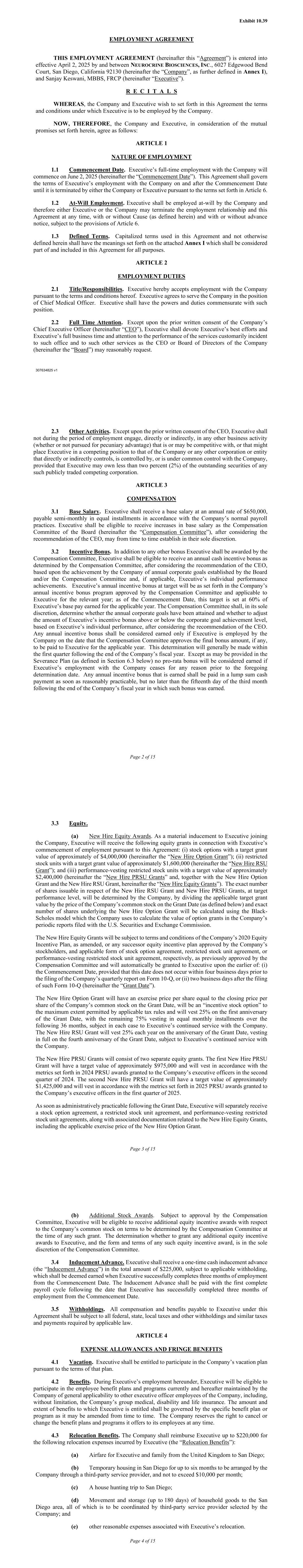 307634825 v1 附件 10.39就业协议本就业协议(以下简称“协议”)由NEUROCRINE BIOSCIENCES,INC.,6027 Edgewood Bend Court,San Diego,California 92130(以下简称“公司”,进一步定义见附件一)与Sanjay Keswani,MBBS,FRCP(以下简称“执行人员”)于2025年4月2日起生效。R E C I T A L S鉴于,公司和执行人员希望在本协议中规定公司将雇用执行人员的条款和条件。因此,公司和执行人员考虑到本协议所载的相互承诺,同意如下:第一条就业性质1.1开始日期。高管在公司的全职工作将于2025年6月2日开始(以下简称“开始日期”)。本协议适用于执行人员在生效日期及之后与公司的雇佣条款,直至公司或执行人员根据第6条规定的条款终止该协议。1.2随意就业。行政人员应由公司随意雇用,因此,在符合第6条规定的情况下,行政人员或公司可随时终止雇佣关系和本协议,无论是否有因由(如本文所定义),也可在有或无事先通知的情况下。1.3定义术语。本协议中使用且未在此另行定义的大写术语应具有所附附件I中规定的含义,该附件I应被视为本协议的一部分并包含在所有目的中。第2条就业职责2.1职称/职责。Executive特此根据本协议的条款和条件接受公司的雇用。高管同意在首席医疗官的职位上为公司服务。行政机关具有与该职务相适应的职权和职责。2.2全时关注。除获得公司首席执行官(以下简称“CEO”)的事先书面同意外,执行人员应将执行人员的最大努力和执行人员的全部业务时间和注意力用于执行通常发生在该办公室的服务以及公司首席执行官或董事会(以下简称“董事会”)可能合理要求的其他服务。第2页,共15页2.3其他活动。除非经首席执行官事先书面同意,否则在受雇期间,执行人员不得直接或间接从事与公司或直接或间接控制、由公司控制或与公司共同控制的任何其他公司或实体具有竞争性或可能使执行人员处于竞争地位的任何其他业务活动(无论是否为金钱利益而追求),但执行人员可能拥有任何此类公开交易的竞争公司的未偿还证券的百分之二(2%)以下。第三条薪酬3.1基薪。高管应获得每年650000美元的基薪,按照公司正常的发薪惯例,每半个月等额分期支付。由于董事会薪酬委员会(以下简称“薪酬委员会”)在考虑首席执行官的建议后,可不时自行酌情确定,因此高管应有资格获得基本工资的增长。3.2奖励奖金。除了薪酬委员会应授予的任何其他奖金外,高管应有资格获得由薪酬委员会在考虑首席执行官的建议后,根据公司实现董事会和/或薪酬委员会制定的年度公司目标以及(如适用)高管的个人绩效成就确定的年度现金奖励奖金。高管的年度激励奖金目标将按照薪酬委员会批准的公司年度激励奖金计划中的规定,适用于相关年度的高管;截至开始日期,该目标设定为高管在适用年度所赚取的基本工资的60%。薪酬委员会应在考虑首席执行官的建议后,根据高管的个人表现,全权酌情决定年度公司目标是否已实现,以及是否调整高管的激励奖金金额高于或低于公司目标实现水平。任何年度奖励奖金只有在薪酬委员会批准最终奖金数额(如有)之日由公司聘用的高管才被视为已赚取, 支付给适用年度的执行人员。这一决定一般会在公司财年结束后的第一季度内做出。除遣散费计划(定义见下文第6.3节)中可能规定的情况外,如果高管在上述确定日期之前因任何原因停止在公司的雇用,则不会被视为获得按比例发放的奖金。所赚取的任何年度奖励奖金应在合理可行的情况下尽快以一次性现金支付的方式支付,但不迟于获得该奖金的公司会计年度结束后的第三个月的第十五天。第3页,共153.3页股权。(a)新雇员股权奖励。作为高管加入公司的重要诱因,高管将根据本协议获得与高管开始受雇相关的以下股权授予:(i)目标授予价值约为4,000,000美元的股票期权(以下简称“新聘人员期权授予”);(ii)目标授予价值约为1,600,000美元的限制性股票单位(以下简称“新聘人员RSU授予”);(iii)目标价值约为2,400,000美元的业绩归属限制性股票单位(以下简称“新聘人员PRSU授予”,连同新聘人员期权授予和新聘人员RSU授予,以下“新聘员工股权授予”)。在目标业绩水平上,就新雇员受限制股份单位授予和新雇员PRSU授予可发行的确切股份数量将由公司确定,方法是将适用的目标授予价值除以授予日(定义见下文)公司普通股的价格,新雇员期权授予的确切股份数量将使用Black-Scholes模型计算,公司使用该模型计算公司向美国证券交易委员会提交的定期报告中的期权授予价值。新员工股权授予将受公司2020年股权激励计划(经修订)或公司股东批准的任何后续股权激励计划的条款和条件以及适用形式的股票期权协议、限制性股票单位协议或业绩归属限制性股票单位协议(分别由薪酬委员会先前批准)的约束,并将在以下较早日期自动授予执行人员:(i)生效日期,前提是该日期不发生在公司季度报告以表格10-Q提交前四个工作日内,或(ii)于提交该等表格10-Q后两个营业日(以下简称“批出日期”)。新聘用期权授予的每股行权价将等于授予日公司普通股的每股收盘价,在适用税务规则允许的最大范围内将是“激励股票期权”,并将在授予日的一周年归属25%,其余75%在接下来的36个月内按月等额分期归属,但在每种情况下取决于高管是否继续为公司服务。新聘受限制股份单位授出将于授出日期周年日每年归属25%,于授出日期四周年全数归属