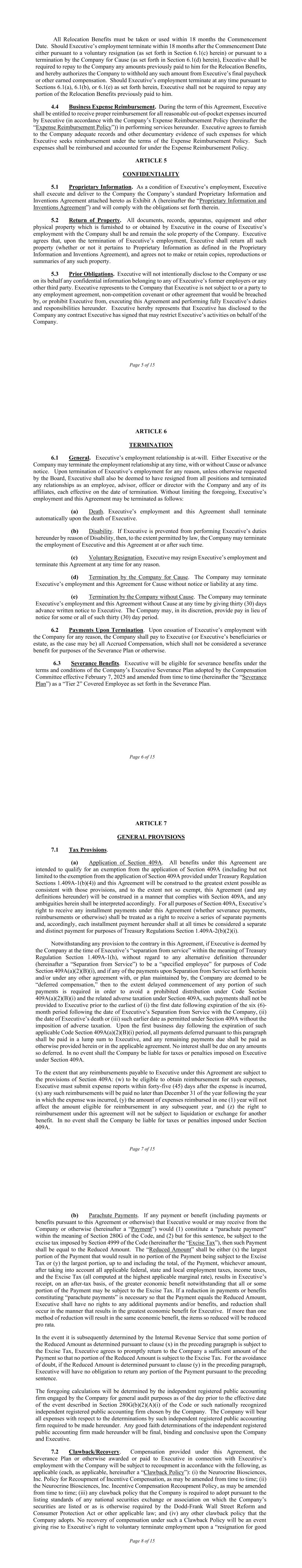 第13页,共15页附件一定义(a)“应计薪酬”是指截至高管终止与公司的雇佣关系之日的以下(如适用):高管的应计但未支付的基本工资、高管在该等计划下的高管权利范围内作为参与者的公司任何计划(养老金和利润分享计划除外)下的任何既得福利或薪酬、任何应计假期工资以及高管因高管对公司的职责而产生的任何适当业务费用。(b)“协议”指公司与执行人员于2025年4月2日订立并生效的雇佣协议。(c)“董事会”具有第2.2节规定的含义。(d)“原因”是指以下任何一种或多种情况的发生:(i)行政人员故意作出对公司业务或声誉造成重大损害的作为或故意不作为;(ii)行政人员故意拒绝或故意不按照董事会或雇员向其报告的其他个人或团体(如适用)的任何合法和适当指示或命令行事(不包括在行政人员身体或精神上无行为能力期间);(iii)行政人员严重违反行政人员的受托、法定、对公司的合同或普通法义务(包括任何重大违反本协议或公司专有信息和发明协议的行为,包括对公司书面政策造成重大损害的任何重大违反);(iv)高管对任何重罪或任何涉及不诚实的罪行的定罪或认罪或不抗辩;或(v)高管参与对公司的任何欺诈或其他故意不当行为;但前提是仅就(i)、(ii)和(iii)而言,如果任何此类事件合理地能够得到纠正,公司应向执行人员提供书面通知,说明此类事件的性质,此后执行人员应有十(10)个工作日来纠正此类事件。(e)“CEO”具有第2.2节规定的含义。(f)“追回政策”具有第7.2节规定的含义。(g)“法典”是指经修订的1986年美国国内税收法典,包括其中规定的任何适用法规和指南。第15(h)页第14页“开始日期”具有第1.1节中规定的含义。(i)“公司”是指Neurocrine Biosciences, Inc.,一家特拉华州公司,或者,在控制权发生变更(定义见遣散计划)后,该事件导致的存续实体。(j)“薪酬委员会”具有第3.1节规定的含义。(k)“残疾”指由第三方长期残疾保险承保人确定的因完全残疾而导致高管满足根据公司长期残疾计划领取福利所需的所有要求的任何身体或精神上的无行为能力导致高管无法履行高管对公司的雇佣职责。(l)“消费税”具有第7.1(b)条规定的含义。(m)“除外债权”具有第7.9条规定的含义。(n)“执行”是指Sanjay Keswani、MBBS、FRCP。(o)“费用报销政策”具有第4.4节规定的含义。(p)“JAMS”具有第7.9条规定的含义。(q)“PAGA”具有第7.9节规定的含义。(r)“付款”具有第7.1(b)条规定的含义。(s)“专有信息和发明协议”具有第5.1节中规定的含义。(t)“减少的金额”具有第7.1(b)节中规定的含义。(u)“第409A条”是指《守则》第409A条和最终条例以及根据其颁布的任何指导意见以及任何具有类似效力的州法律。(v)“离职”具有第7.1(a)节规定的含义。(w)“遣散计划”具有第6.3节规定的含义。第15页,共15页展示专有信息和发明协议