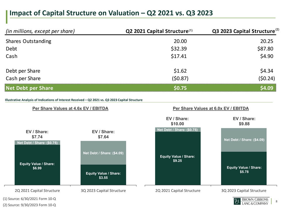 资本Structure对估值的影响– 2021年Q2对比2023年Q3(2)(1)(百万,除每股外)2021年第二季度资本结构Structure 2023年第三季度资本Structure已发行股份20.00 20.25债务$ 32.39 $ 87.80现金$ 17.41 $ 4.90每股债务$ 1.62 $ 4.34每股现金($ 0.87)($ 0.24)每股净债务$ 0.75 $ 4.09收到的利息迹象的说明性分析– 2021年第二季度与2023年第三季度资本结构Structure每股价值按4.6倍EV/EBITDA每股价值按6.0倍EV/EBITDA EV/share:EV/share:$ 10.00 $ 9.88净债务/share:($ 0.75)EV/share:$ 7.74 $ 7.64净债务/share:($ 4.09)净债务/share:($ 0.75)净债务/股份:(4.09美元)股权价值/股份:9.25美元股权价值/股份:股权价值/股份:6.99美元5.78美元股权价值/股份:3.55美元2021年第二季度资本Structure 2023年第三季度资本Structure 2023年第三季度资本Structure(1)资料来源:6/30/2021表格10-Q 8(2)资料来源:9/30/2023表格10-Q