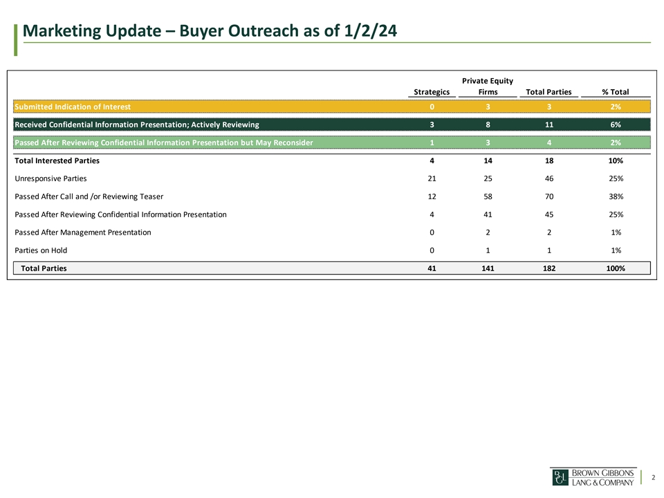 营销更新–截至24年1月2日的买方外联私募股权策略公司总缔约方数%提交的感兴趣的指示总数0332%收到机密信息介绍;积极审查38116%在审查机密信息介绍后通过,但可能重新考虑1342%感兴趣的总缔约方4141810%无响应方21254625%在电话后通过和/或审查Teaser 12587038%在审查机密信息介绍后通过4414525%在管理层介绍后通过0221%缔约方搁置0111%缔约方总数41141182100% 2