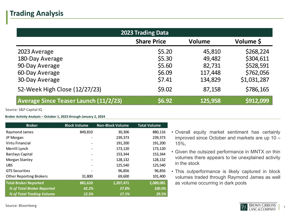 交易分析2023交易数据股价成交量$ 2023平均$ 5.2045,810 $ 268,224 180天平均$ 5.3049,482 $ 304,611 90天平均$ 5.6082,731 $ 528,591 60天平均$ 6.09 117,448 $ 762,056 30天平均$ 7.41 134,829 $ 1,031,287 52周最高收盘价(12/27/23)$ 9.0287,158 $ 786,165自Teaser推出(11/2/23)以来的平均水平$ 6.92 125,958 $ 912,099资料来源:标普 Capital IQ经纪商活动分析– 2023年10月1日至1月2日,2024年经纪商Block交易量非大宗交易量总交易量Raymond James 849,81030,306880,116 •整体股票市场情绪确实有所改善JP Morgan-239,373239,373自10月以来有所改善,市场上涨10 – Virtu Financial-191,200191,20015%,Merrill Lynch-173,120173,120 • Given the outsided performance in MNTX on thin TERMA Capital-153,344153,344 volumes there appears to be unexplained activity TERM0-128,132128,132 in the stock UBS-125,540125,540 GTS Securities-96,85696,856 • this outstanding performance is likely captured in block Other reporting brokers 31,80069,600101,400 volumes traded through Raymond James as well total broker reported 881,6101,207,4712,089,081 as volume occurred in dark pool % of total