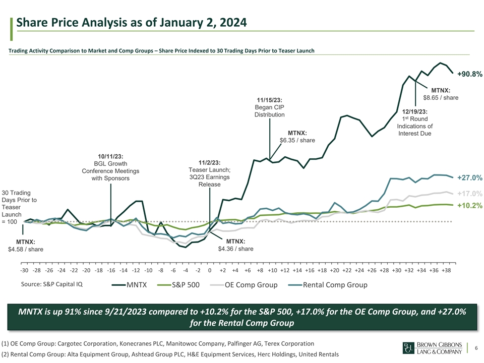 截至1月2日股价分析,2024年交易活动与市场的比较AND COMP Groups –股价指数至Teaser Launch前30个交易日+ 90.8% MTNX:$ 8.65/share 11/15/23:began CIP 12/19/23:distribution ST 1 round indications of MTNX:due interest $ 6.35/share 10/11/23:11/2/23:BGLGrowth Teaser launch;conferences meetings 3Q23 earnings with sponsors + 27.0% release 30 trading + 17.0% days before + 10.2% Teaser launch = 100 MTNX:MTNX:$ 4.36/share $ 4.58/share-30-28-26-24-22-20-18-16-14-12-10-8-6-4-2 0 + 2 + 4 + 6 + 8 + 10 + 12 + 14 + 16 ++ 32 + 34 + 36 + 38资料来源:标普 Capital IQ MNTX标普 500 OEC COMP Group Rental COMP Group MNTX自2023年9月21日以来上涨了91%,相比之下,标普 500指数上涨了+ 10.2%,OEC COMP Group上涨了+ 17.0%,Rental COMP Group上涨了+ 27.0%(1)OEC COMP Group:Cargotec Corporation、Konecranes PLC、Manitowoc Company、Palfinger AG、Terex Corporation 6(2)Rental COMP Group:Alta Equipment Group,Ashtead Group PLC,H&E设备服务,Herc Holdings,TERM6 United Rentals