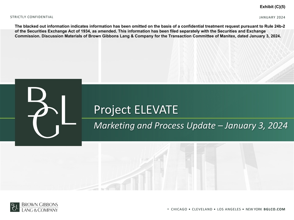 附件(c)(5)严格保密2024年1月涂黑的信息表明,根据经修订的1934年证券交易法规则24b-2提出的保密处理请求,信息已被遗漏。这些信息已分别提交给美国证券交易委员会。Brown Gibbons Lang & Company为Manitex交易委员会提供的讨论材料,日期为2024年1月3日。Project ELEVATE营销和流程更新– 2024年1月3日•芝加哥•克里夫兰•洛杉矶•纽约BGLCO.com