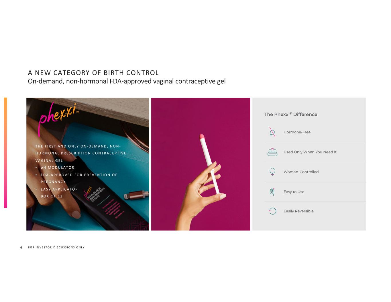 F O R I N V E S T O R D I S C U S I O N S O N L Y一种新的按需节育类别,非激素FDA批准的阴道避孕凝胶T H E F I R S T A N D O N L Y O N-D E M A N D,N O N-H O R M O N A L P R E S C R I P T I O N C O N T R A C E P T I V E A G I N A L G E L • PH M O D U L A T O R • F D A-A P P R O V E N T I O N O F P R E G N A N C Y • EA S Y A P L I C A T O R • B O X O F 126