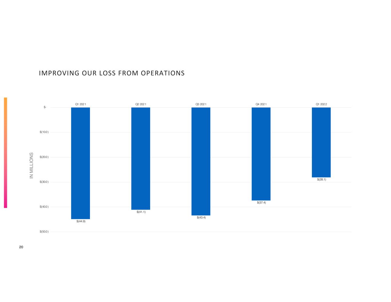 $(44.9)$(41.1)$(43.4)$(37.4)$(28.1)$(50.0)$(40.0)$(30.0)$(20.0)$(10.0)$-Q1 2021 Q2 2021 Q3 2021 Q4 2021 Q1 2022改善我们在M il li o ns的运营损失20
