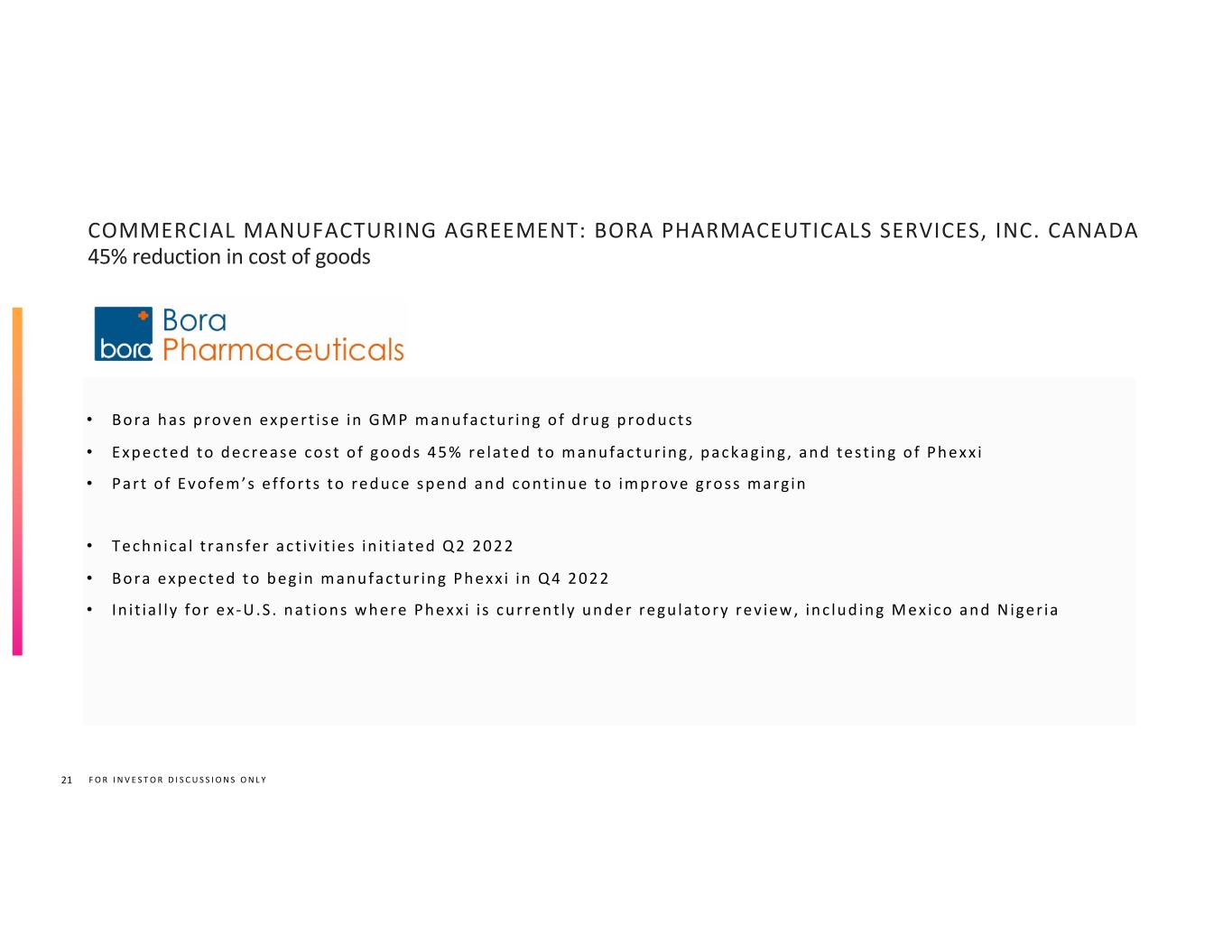 F O R I N V E S T O R D I S C U S I O N S O N L Y商业制造协议:BORA PHARMACEUTICALS SERVICES,INC。加拿大商品成本降低45% • B O RA H作为在G M P M中的EXP以及在G O F D RU G P RO D U CTS中的事实• EXP将增加5%m an u factu r in g,p ackag in g,一个d tes t in g o f p h exx i • p art o f evo fem的eft to red u ce sp en d co n t in u e to im p ro ve gro ss m arg in •技术运行在I T IA TED Q 22022 • B O RA EXP与B EG在G P H EXX I在Q 4中的Man U Factu R相关2022 •在未来的未来中,在未来的未来RY修订,在c lu d in g m ex ico和d n iger ia 21