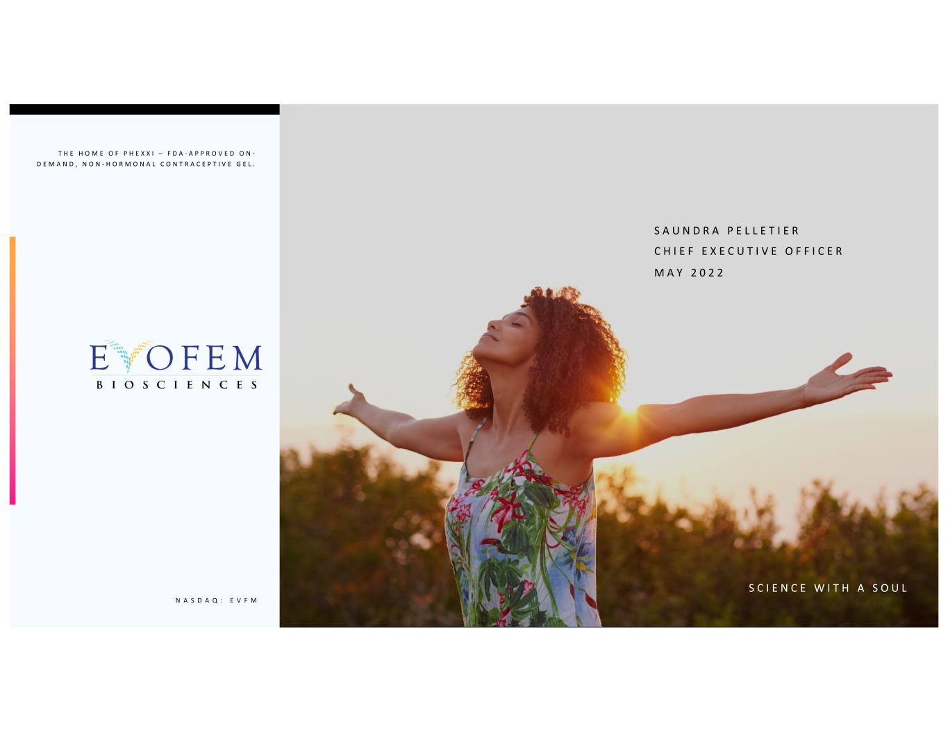 F O R I N V E S T O R D I S C U S I O N S O N L Y T H O M E O F P H E X X I – F D A-A P P RO V E D O N-D E M A N D,N O N-H O R M O N A L C O N T R A C E P T I V E G E L。S C I E N C E W I T H A S O L S A N D R A P E L E T E R C H I E F E X E C U T I V E F IC E R M A Y 2022 N A S D A Q:E V F M