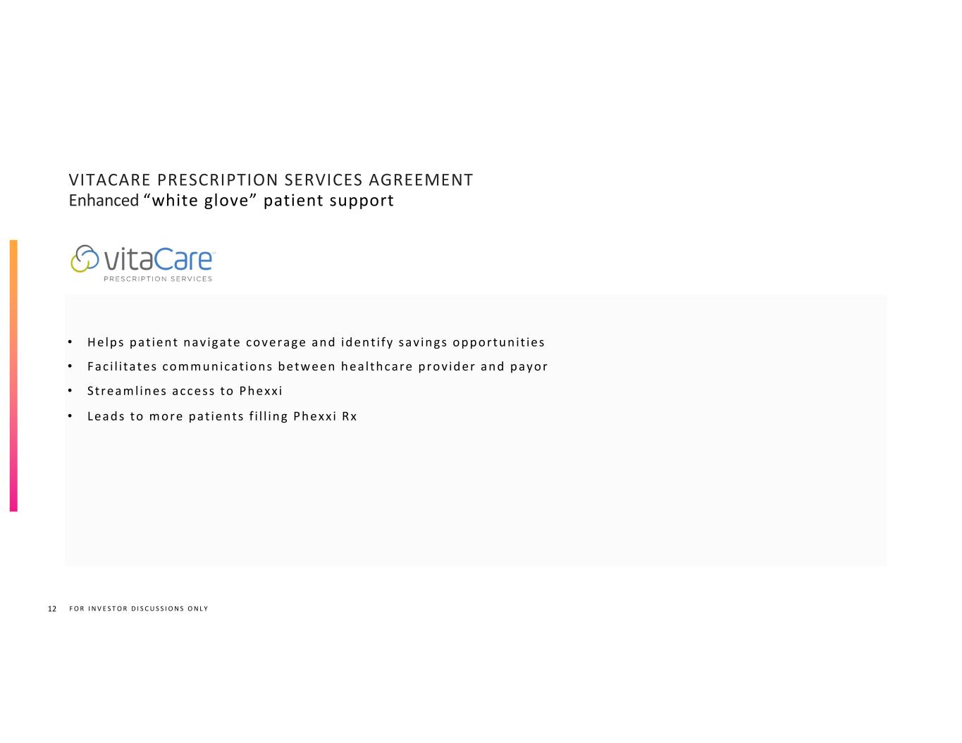 F O R I N V E S T O R D I S C U S I O N S O N L Y VitaCare处方服务协议增强的“白手套”患者支持• H ELP在Gs O P O RTU中的财务报表• Fac I L I TA TES CO M U N ICAT ION S B ETW EN H EA L TH CARE P RO V ID ER AN P AYOR •在ES中流L访问P H EXX I •在G P H EXX I R X 12中引导S到M O RE P