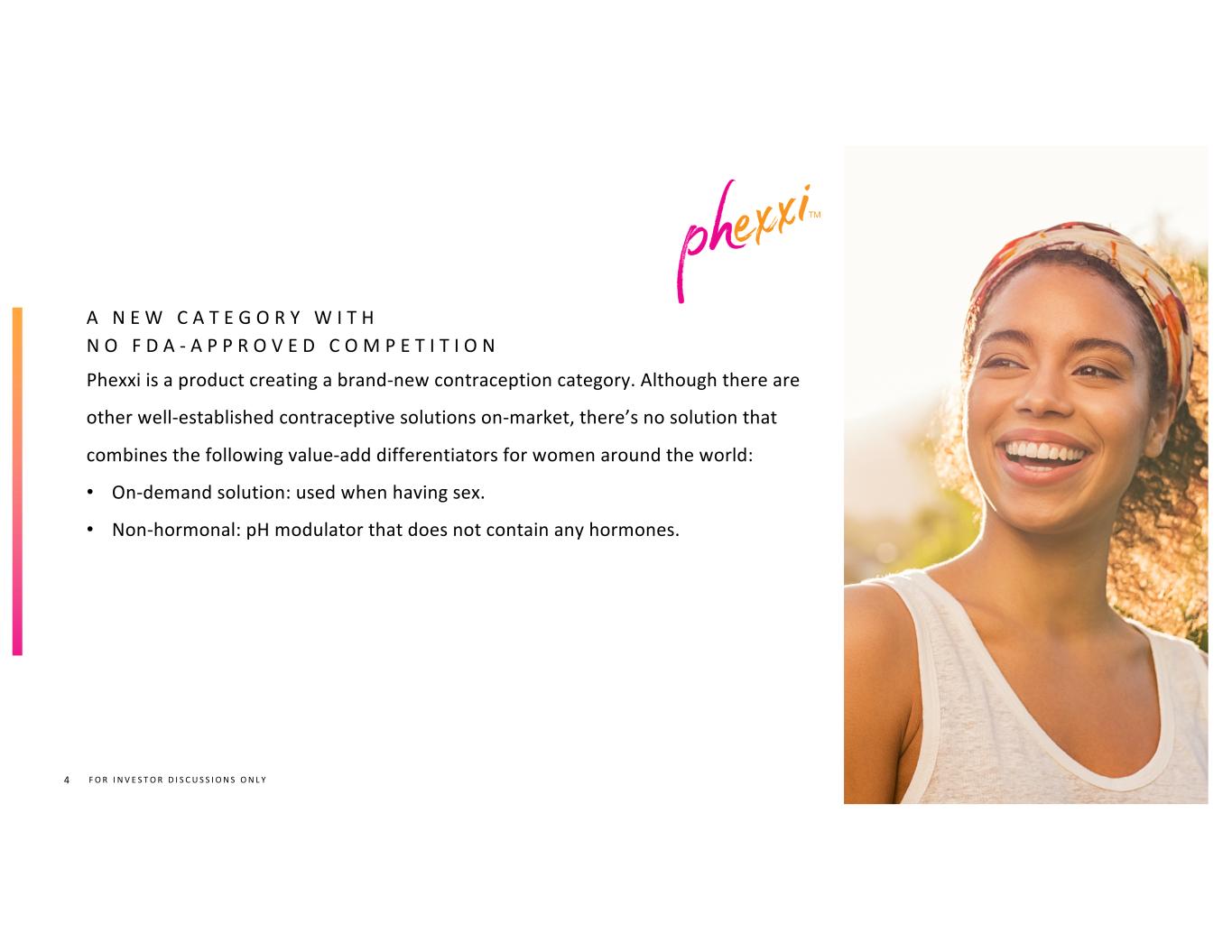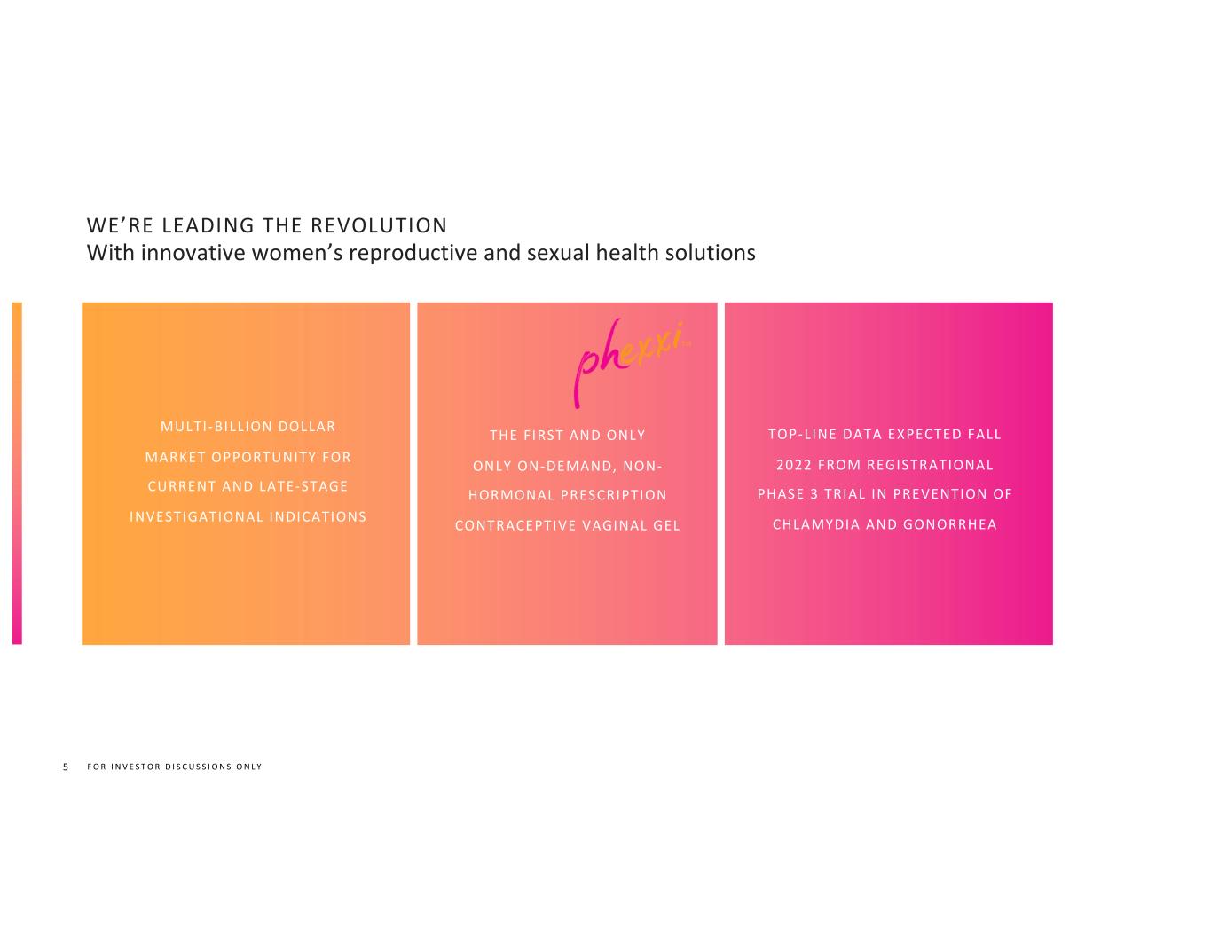 F O R I N V E S T O R D I S C U S I O N S O N L Y我们正在以创新的女性生殖技术引领革命和性健康解决方案当前和后期研究适应症的数十亿美元市场机会第一个也是唯一一个按需、非激素处方避孕阴道凝胶的顶线数据预计2022年秋季来自预防衣原体的注册第3期试验和淋病5