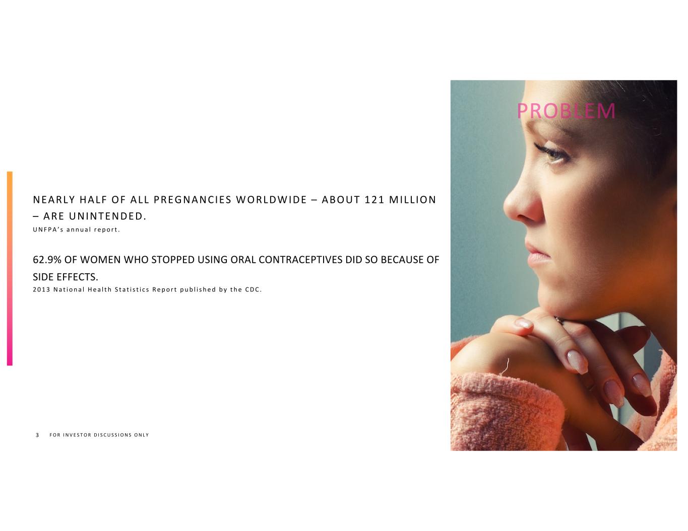 F O R I N V E S T O R D I S C U S I O N S O N L Y近一半的意外怀孕——大约121百万次——是意外的。U N F P A’S A N N U A L R E P O R T。62.9%的停止使用口服避孕药的妇女是因为副作用。2013 N A T I O N A L H A L T H S T A T I S T I C R E P O R T P U B L I S H E D Y T H E C DC。33