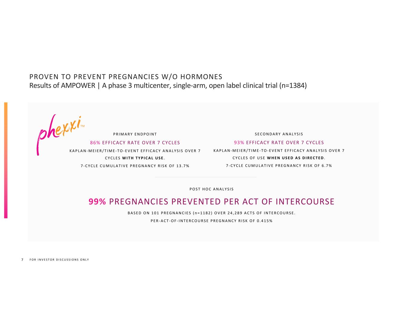 F O R I N V E S T O R D I S C U S I O N S O N L Y被证明可以预防怀孕,没有激素AmPower的结果|第3阶段多中心, 单臂, 开放标签临床试验(n = 1384)P R I M A R Y E N D P O I N T 86% 7个周期的有效率K A P L A N-M E I E R/T I M E-T O-E V EN T E F F I C A C Y A N A L S I S O R 7 C Y C L E S W I T H T Y P I C A L U S E。7-C Y C L E C U M U L A T I V E P R E G N A N C Y R I S K O F 13。7% P O S T H O C A N A L Y S I S 99%通过性交行为防止怀孕101 P R E G N A N C I E S(N = 1182)O V E R 24, 289 A C T S O F I N T E R C O U R S E。P E R-A C T-O F-I N T E R C O R S E P R E G N A N C Y R I S K O F 0。415% 7 S E C O N D A R Y A N A L Y S I S 93% 7个周期的有效率K A P L A N-M E E R/T I M E-T O-EV E N T E F F I C A C Y A N A L Y S I S O R 7 C Y C L E S O F U S E W H E N U S D I Re c t e d。7-C Y C L E C U M U L A T I V E P R E G N A N C Y R I S K O F 6。7 % ,