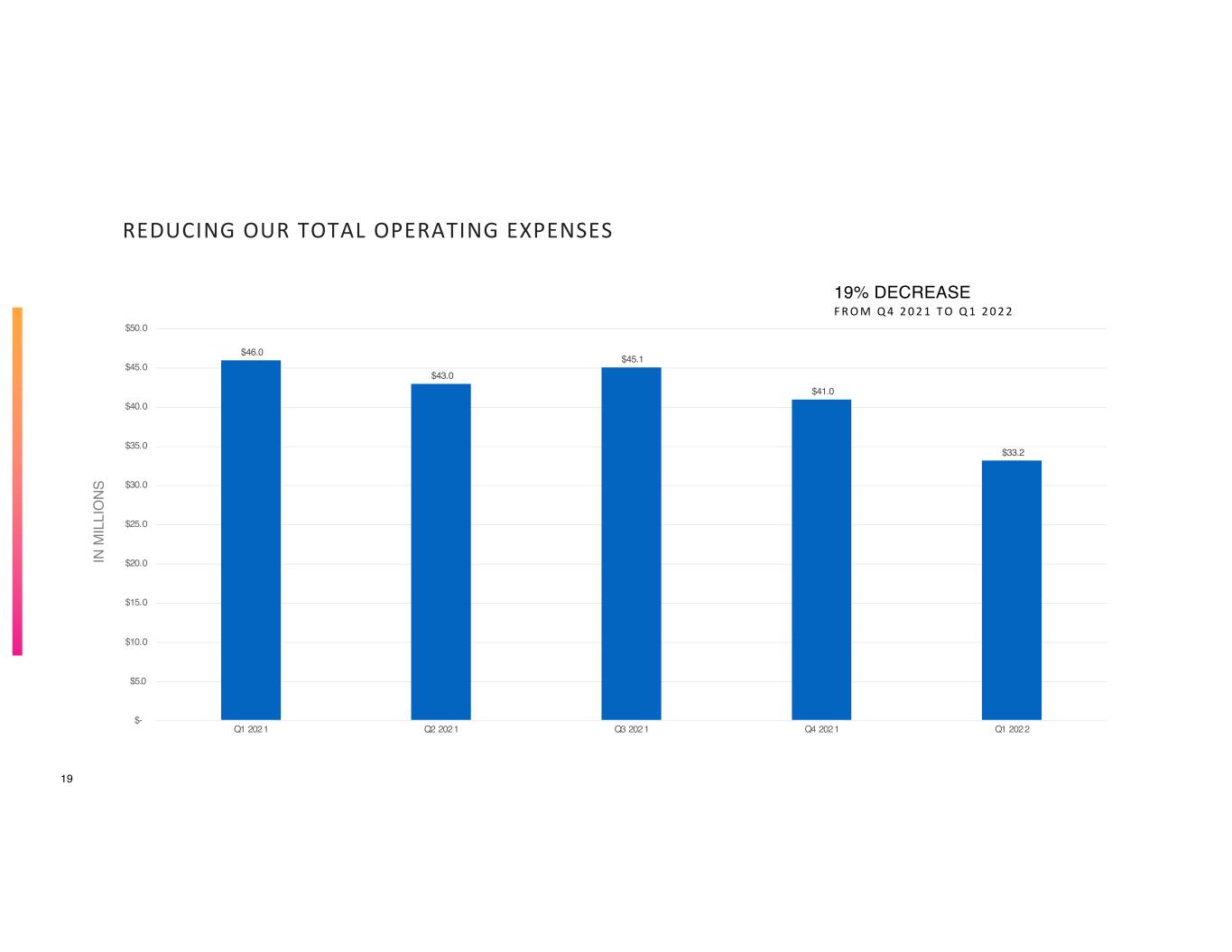 46.0美元43.0美元45.1美元41.0美元33.2美元-5.0美元10.0美元15.0美元20.0美元25.0美元30.0美元35.0美元40.0美元45.0美元50.0美元2021年第一季度2021年第二季度2021年第二季度2021年第三季度2021年第四季度2021年第一季度总营业费用减少19%o Q 1202219