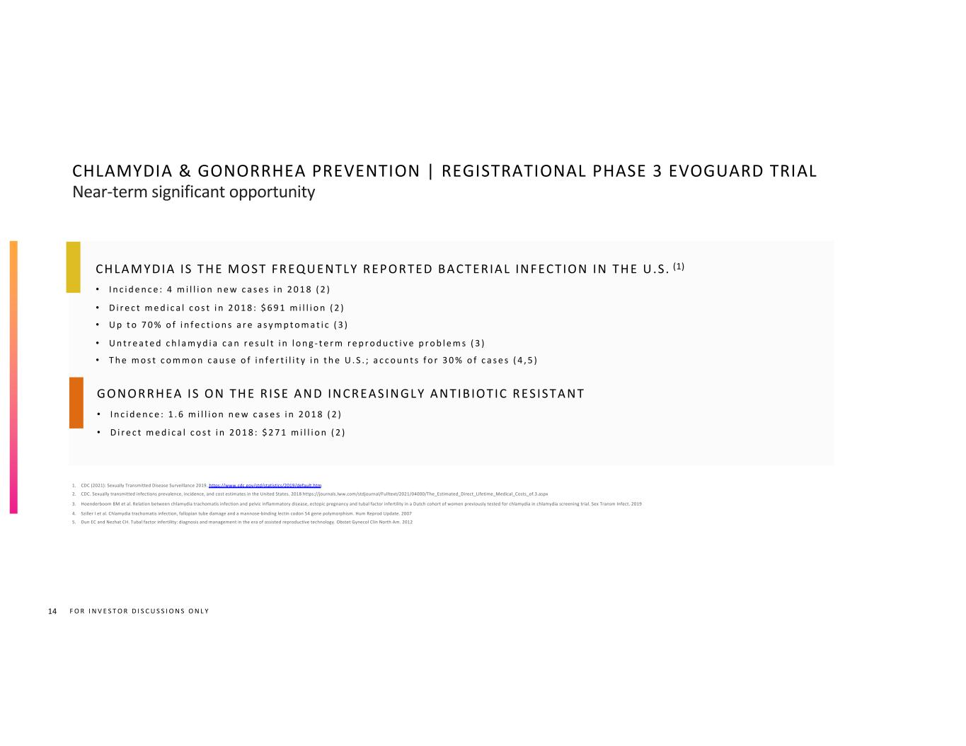 F O R I N V E S T O R D I S C U S I O N S O N L Y衣原体和淋病预防|注册第3阶段EVOGUARD试验近期重要机会是T F R EQ U ENTY R EP O R TED B A CTER IA L IN ECT ION IN THE U.S。(1)• I N C I D E N C E C E C E S I N 2014(2)• D I R E C T M E D I C AL C O S T I N 2018:$ 691 M I L I O N(2)• U P T O 70% O F I N F E C T I O N S A R EA S Y M P T O M A T I C(3)• U N T R E A T E D C H L A M Y D I A C A N R E S U L T I N L O N G-T E R M R E P R O D U C T I V E P R O B L E M S(3)• T H E M O S T C O M O N C A U S E O FI N F E R T I T Y I N T H E U。s。C C O N T S F O R 30% O F C A S E S(4, 5)G O N O R H EA是在Cr EA SIN G LY A N TIB IO TIC ES ISTA N T • I N C I D E N C E:1。6 M I L L I O N E W C A S E S I N 2018(2)• D I R E C T M E D I C A L C O S T I N 2018:$ 271 M I L I O N(2)1。CDC(2021):性传播疾病监测2019。https://www.cdc.gov/std/statistics/2019/default.htm 2。疾病预防控制中心。性传播感染流行率, 发生率, 和美国的成本估算。2018 https://journals.lww.com/stdjournal/fulltext/2021/04000/THE _ ESTABLIATED _ DIRECTION _ MEDICAL _ COSTS _ OF.3.aspx 3。Hoenderboom BM等人。沙眼衣原体感染与盆腔炎的关系 荷兰一组妇女的异位妊娠和输卵管因素不孕症先前在衣原体筛查试验中进行了衣原体检测。性传播感染。2019 4 .Sziller I等人。沙眼衣原体感染, 输卵管损伤与甘露糖结合凝集素密码子54基因多态性。哼reprod更新。2007 5 .Dun EC和Nezhat Ch。输卵管因素不孕症:辅助生殖技术时代的诊断与治疗。Obstet Gynecol CLIN北上午。2012 14 ,