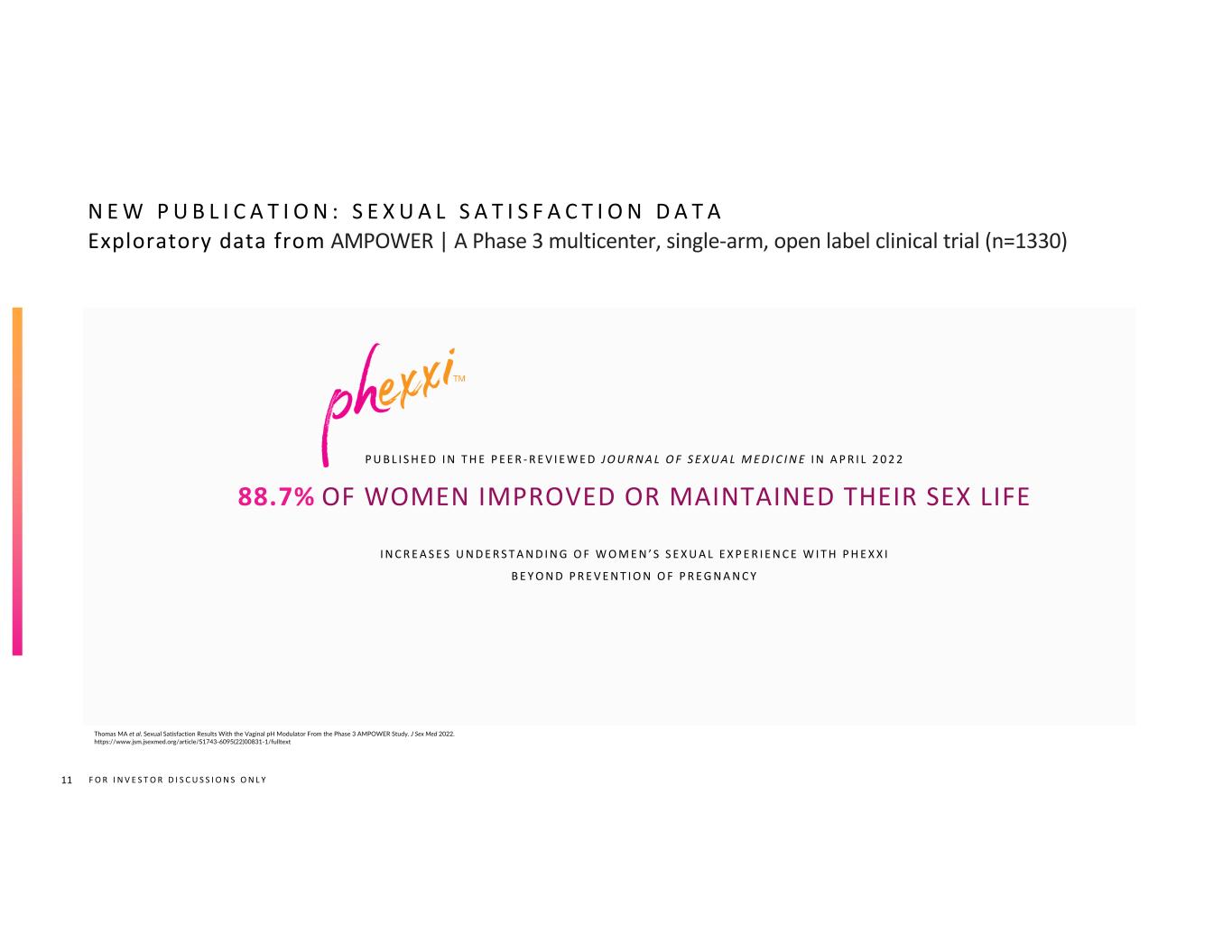 F O R I N V E S T O R D I S C U S S I O N L Y N E W P U B L I C A T I O N:S E X U A L S A TI S F A C T I O N D A A来自AMPOWER的探索性数据|第3阶段多中心、单臂、开放标签临床试验(n = 1330)P U B L I S H E D I N T H E E E R-R E V I E E D J O U R N A L O F S E X U A L M E DI C I N E I N A P R I L 202288.7%的女性改善或维持性生活I N C R E A S E S U N D I N G O FW O M E N的E X U A L E X P E R I E N C E W T H P H E X X I B E Y N D P R E V E N T I O NO F P R E G N A N C Y Thomas MA等人。来自第3阶段AMPOWER研究的阴道pH调节剂的性满意度结果。J Sex Med 2022。https://www.jsm.jsexmed.org/article/s1743-6095(22)00831-1/fulltext 11