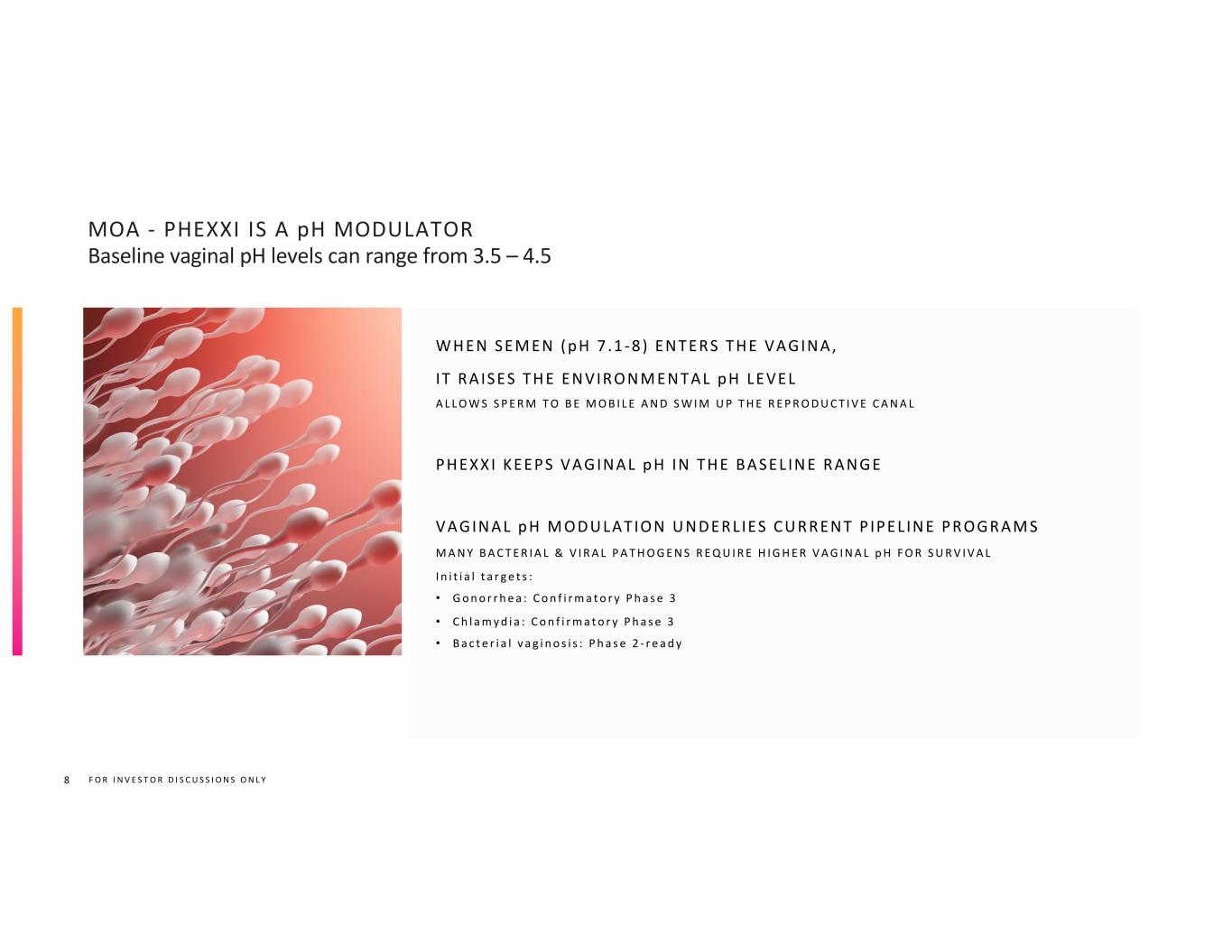 F O R I N V E S T O R D I S C U S I O N S O N L Y MOA-PHEXXI是一种pH调节剂基线阴道pH水平范围为3.5 – 4.5 W H en sem en(P H7.1-8)在A中的TER,它是在一个L L P P E R M T O B E M O B I L E A N D S W I M U P T的LEVH E R E P R O D U C T I V E C A N A L P H EXXI KEEP S V A G IN E R A N G E V A G在E P R O G R A M M A N Y B A C T E R I A L &V I R A L P A T H O G E N S R E Q U I R E H G I N P H F O R S U R V I V A L I NI T I A L T A R G E T S:• G O N O R H E A:C O N F I R M A T O R Y P H A S E 3 • C H L A M YD I A:C O N F I R M A T O R Y P H A S E 3 • B A C T E R I A L V A G I N O S I S:P H A S E 2-R E A D Y 8