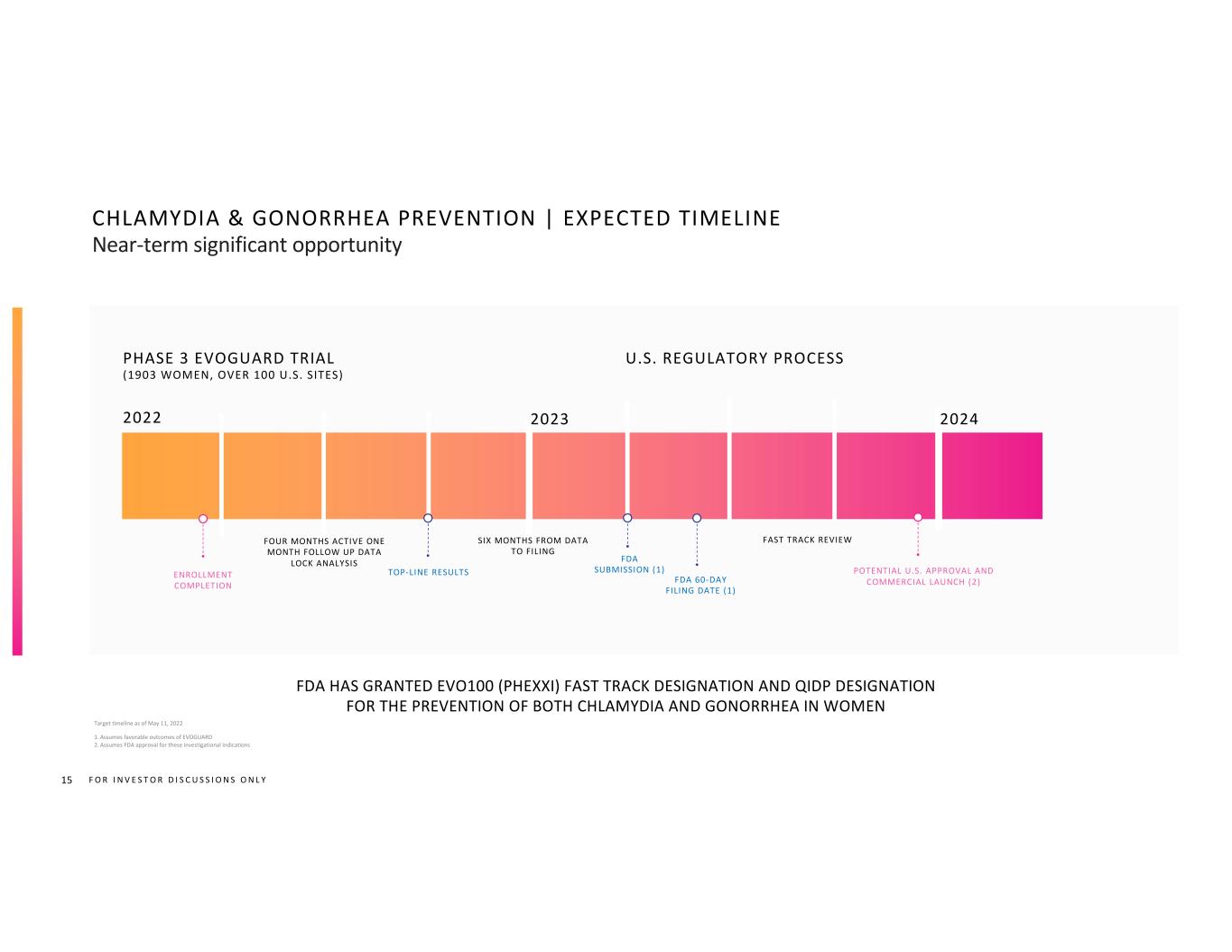 F O R I N V E S T O R D I S C U S I O N S O N L Y衣原体和淋病预防|预期时间表近期重要机会第3阶段EVOGUARD试验(1903名女性,超过100个美国站点)FDA已授予EVO100快速通道指定和QIDP指定,用于预防女性衣原体和淋病美国监管程序2022232024潜在的美国批准和商业发布(2)注册完成四个月活跃一个月随访数据锁定分析从数据到提交FDA提交六个月的顶线结果(1)FDA 60天提交日期(1)快速通道审查目标时间表截至2022年5月11日1。假设Evoguard 2的结果良好。假设FDA批准这些研究适应症15