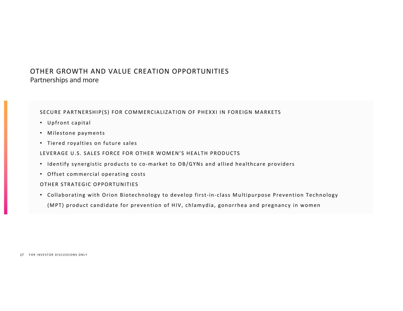 F O R I N V E S T O R D I S C U S I O N S O N L Y其他增长和价值创造机会合作伙伴关系以及更多的EIG中的其他部分的知识产权•从上到下•在这些情况下,我们将继续LEV。如果有LTH或多个CTS • ID IN T I FY SYN ERG是由CTS到O B/G YN S的共同市场A D A L IED H EA L TH CARE P RO V ID ERS • O FFSET CO M ERC IA L P ERAT IN G CO STS O STR A TEG IC O P O R TU ITIES •Co l lab o rat in gw with o r io n o logy to d eve lo p f i r s t-in-c lass m u lt ip u rp o se p reven t in tech nO logy(m p t)P ro d u ct can id id id for r p reven to o f h iv,ch lam yd ia,去N O RRH EA和D P REGN和CY在W O M EN 17