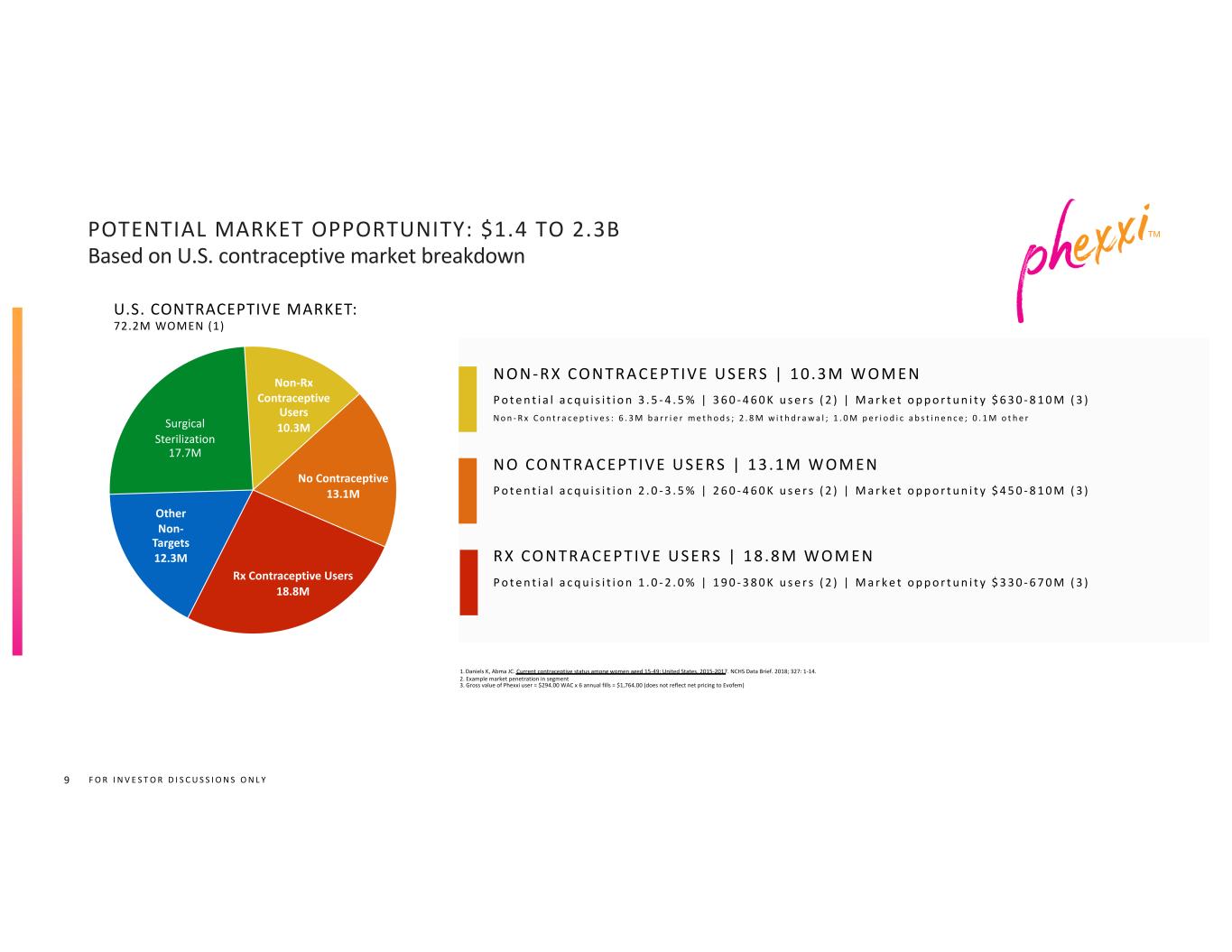 F O R I N V E S T O R D I S C U S I O N O N L Y潜在市场机会:$ 1.4至2.3B基于美国避孕药具市场细分N O N-R X CO N TR A CEP TIV EUS ER S | 10.3 M W O M EN P O T E N T I A L A C Q U I S I T I O N 3。5 - 4 .5% | 360-460 K U S E R S(2)| M A R K E T O P O R T U N I T Y $ 630-810 M(3)NO N-R X C O N T R A C E P T I V E S:6。3 M B A R R I E R M E T H O D S;2。8 M W I T H D R A W A L;1。0 M P E R I O D I C A B S T I N C E;0。1 M O T H E R其他非目标123M外科绝育手术1770万非Rx避孕者1030万无避孕者1310万Rx避孕者1880万N O CO N TR A CEP TIV E S | 13.1 M W O M EN P O T EN T I A L A C Q U I S I T I O N 2。0 - 3 .5% | 260-460 K U S E R S(2)| M A R K E T O P O R T U N I T Y $ 450-810 M(3)RX CO N TR A CEP TIV E U S S | 18.8 M W O M EN P O T E N T I A L A C Q U I S I T I O N 1。0 - 2 .0% | 190-380 K U S E R ABMA JC。目前15-49岁妇女的避孕状况:美国, 2015-2017 .NCHS数据摘要。2018 ; 327 : 1-14 .2 .细分市场3的市场渗透示例。Phexxi用户的总价值= 294.00美元WAC x 6年填充= 1,764.00美元(不反映Evofem的净定价)9美国避孕市场:7220万女性(1), S(2)| M A R K E T O P O R T U N I T Y $ 330-670 M(3)1。丹尼尔斯·K