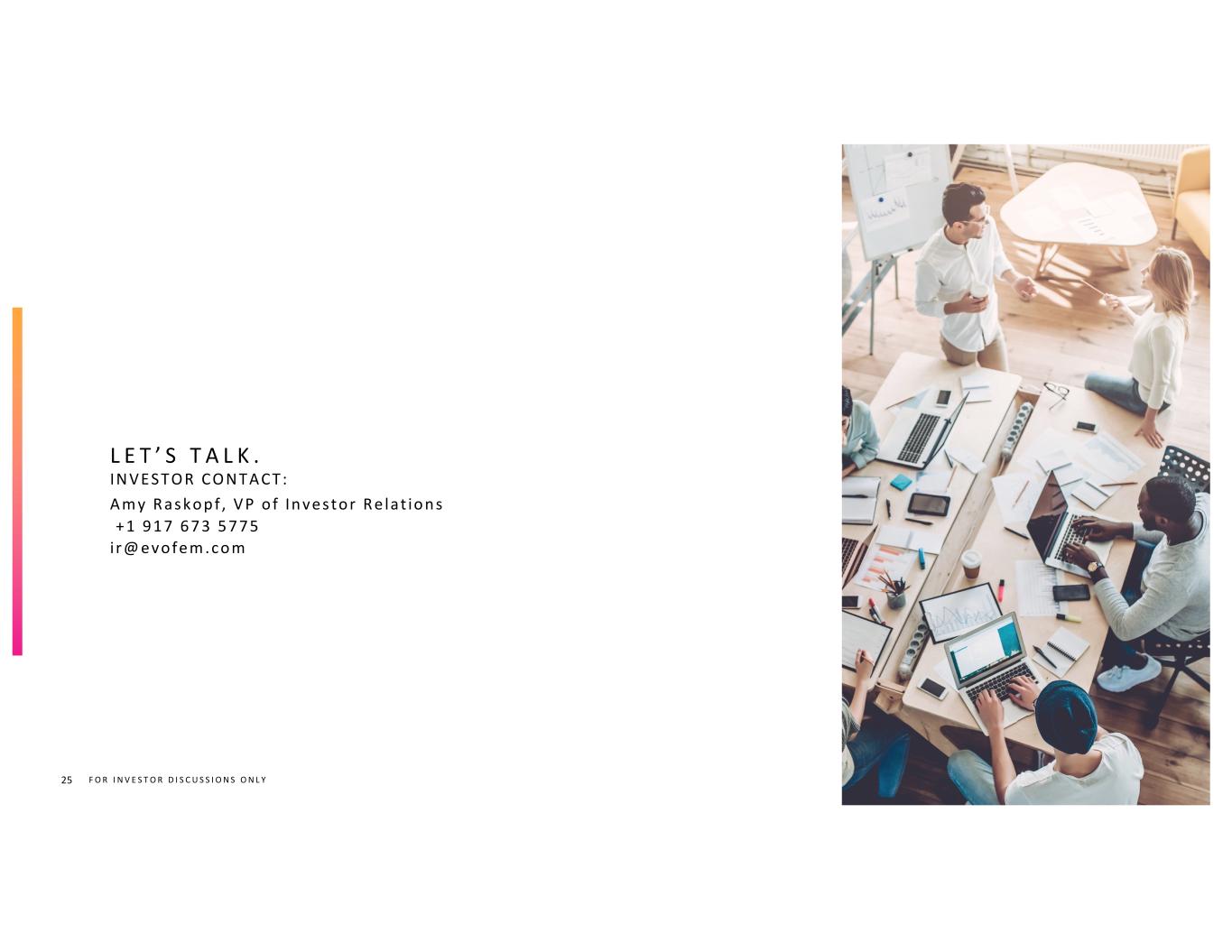 F O R I N V E S T O R D I S C U S I O N S O N L Y L E T A L K。对R CO N T A CT的评估:A M Y R ASKO P F,V P O F IN VESTO R R E LAT IO N S + 19176735775 I R @ EVO FEM.CO M 25