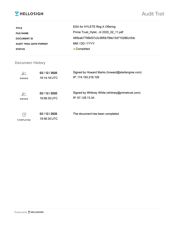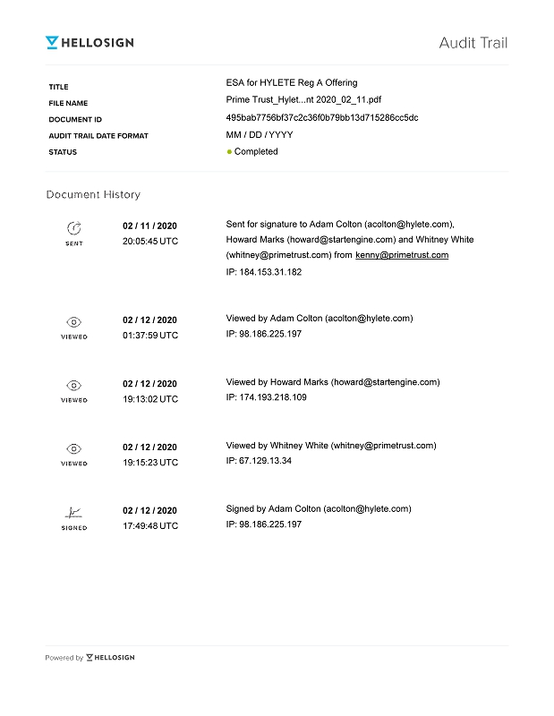 HYLETE REG A发售的ESA PRIME TRUST _ HYLET... NT 2020_02_ 11.pdf 495BAB7756BF37C2C36F0B79BB13D715286CC5DC MM/DD/YYY完成02/11/202020:05:45 UTC发送给Adam Colton签名,霍华德·马克斯和Whitney White来自kenny@primetrust.com IP:184.15 3.3 1.18 202/12/202001:37:59 UTC由Adam Colton观看IP:98.186.225.19702/12/202019:13:02 UTC由Howard Marks观看IP:174.193.2 18.109/12/202019:15:23 UTC由Whitney White观看IP:67.12 13.3402/12/202017:49:48 UTC由Adam Colton签名IP:98.186.22 5.197
