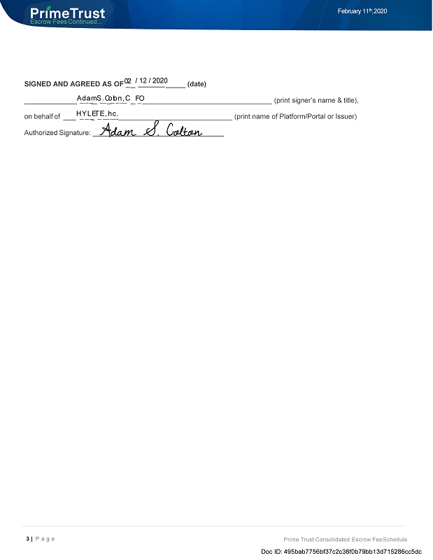 | 3. | 存入托管账户。发行人及其代理人将指示所有订阅者通过托管代理的技术系统(“发行人仪表板”)将其数据和订阅金额直接传输到根据本协议条款为订阅者的利益而持有的托管账户协议和适用法规。所有订户将直接将资金转入托管代理(如果有支票,支票抬头为“Prime Trust,LLC作为HYLETE公司投资者的托管代理”),以存入托管账户。托管代理应处理通过银行系统收取的所有认购金额(虚拟货币除外),应持有托管金额,并应对发布到其分类账的每个此类认购金额进行核算,其中还规定,除其他外,每个订阅者的姓名和地址,购买的证券数量和支付的金额。已清算银行系统的所有认购金额,或在虚拟的情况下 货币确认为收到,以下简称“托管金额”。不得就托管账户中的余额向发行人或认购人支付利息。发行人应在任何新的或修改后的认购协议(均称为“认购协议”)和/或发售材料的同时,立即,向托管代理提供托管代理合理要求的此类修订文件和其他信息的副本,这是履行其在本协议项下的职责所必需的。托管代理没有义务或责任强制收取任何订阅金额,无论是否根据本协议交付给它。发行人应与托管代理合作清算任何和所有反洗钱和资金处理例外情况。 |