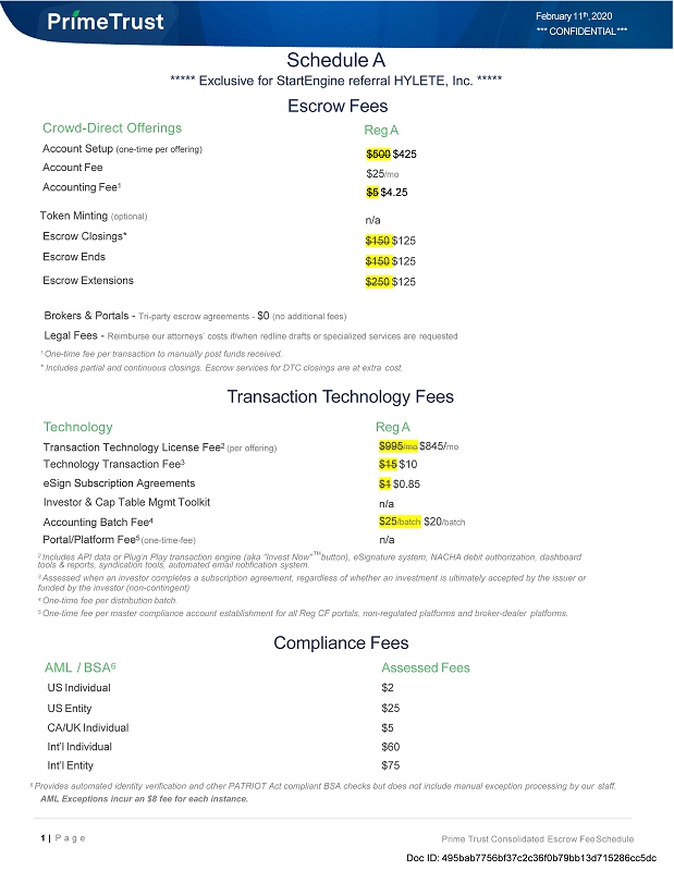 附表A * * * * *仅适用于Startengine推荐HYLETE,Inc. * * * * *托管费用Reg A $ 500 $ 425 Crowd-Direct Offerings账户设置(每次提供一次)账户费用会计费用1 $ 25/mo $ 5 $ 4.25 N/a $ 150 $ 125 $ 150 $ 125 Token Minting(可选)托管关闭*托管结束托管扩展$ 250 $ 125经纪人和门户-TRI-当事人托管协议-0美元(无额外费用)法律费用-如果/当需要红线草稿或专业服务时,偿还我们的律师费用1每笔交易手动过帐收到的资金的一次性费用。*包括部分和连续关闭。DTC关闭的托管服务需支付额外费用。技术交易技术费用Reg A $ 995/mo $ 845/mo $ 15 $ 10 $ 1 $ 0.85 n/a $ 25/ba t c h $ 20/batch transaction技术许可费2(每次发行)技术交易费3 esign订阅协议Investor & Cap Table MGMT工具包会计批量费用4门户/平台费用5(一次性-费用)N/A 2包括API 数据或即插即用交易引擎(又名“立即投资”™按钮)、电子签名系统、NACHA借记授权、仪表板工具和报告、联合工具、自动电子邮件通知系统。3当投资者完成认购协议时进行评估,无论投资是否最终被发行人接受或由投资者提供资金(非或有)4每批分配的一次性费用。5所有Reg CF门户、非监管平台和经纪商平台的每个主合规帐户建立的一次性费用。合规费用6提供自动身份验证和其他符合爱国者法案的BSA检查,但不包括我们员工的手动异常处理。AML例外每次都会产生8美元的费用。AML/BSA 6美国个人评估费用$ 2美国实体$ 25 加利福尼亚州/英国个人$ 5国际个人$ 60国际实体$ 752020年2月11日* * *机密* * * 1 | P A G E Prime Trust Consolidated Escrow Fee Schedule Doc 编号:495BAB7756BF37C2C36F0B79BB13D715286CC5DC