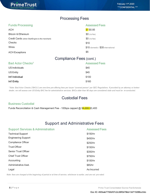 托管费用继续..。合规费用(续)7注:不良行为者支票(“BAC”)是根据SEC规定,每个发行人“涵盖人员”的一次性发行前费用。如果由律师或经纪自营商提供,我们将评估一个美国实体的行政服务的BAC费用。超过90天的BACS被认为是过时的,必须重新进行。支持和管理费用注:费用在期初或服务时收取,以较早者为准,不按比例收取。资金处理ACH比特币和以太币信用卡(当StartEnGine是商家时)检查S电汇ACH异常处理费用评估费用$ 1 $ 0.85 $0(无费用)$0(无费用)$ 10 $ 15国内/$ 35国际$ 5坏演员支票7美国个人评估费用$ 45美国实体$ 45国际个人100美元国际实体160美元托管费业务托管资金对账和现金管理费-100bps上限@$4,000 $ 3,400支持服务和行政技术支持 工程支持合规官信托官高级信托官首席信托官会计行政助理。法律2 | P A G E Prime Trust Consolidated Escrow Fee Schedule Doc ID:495BAB7756BF37C2C36F0B79BB13D715286CC5DC评估费用$ 150/HR $ 450/HR $ 250/HR $ 150/HR $ 350/HR $ 750/HR $ 100/HR $ 85/HR 2月11日发生,2020 * * *机密* * *