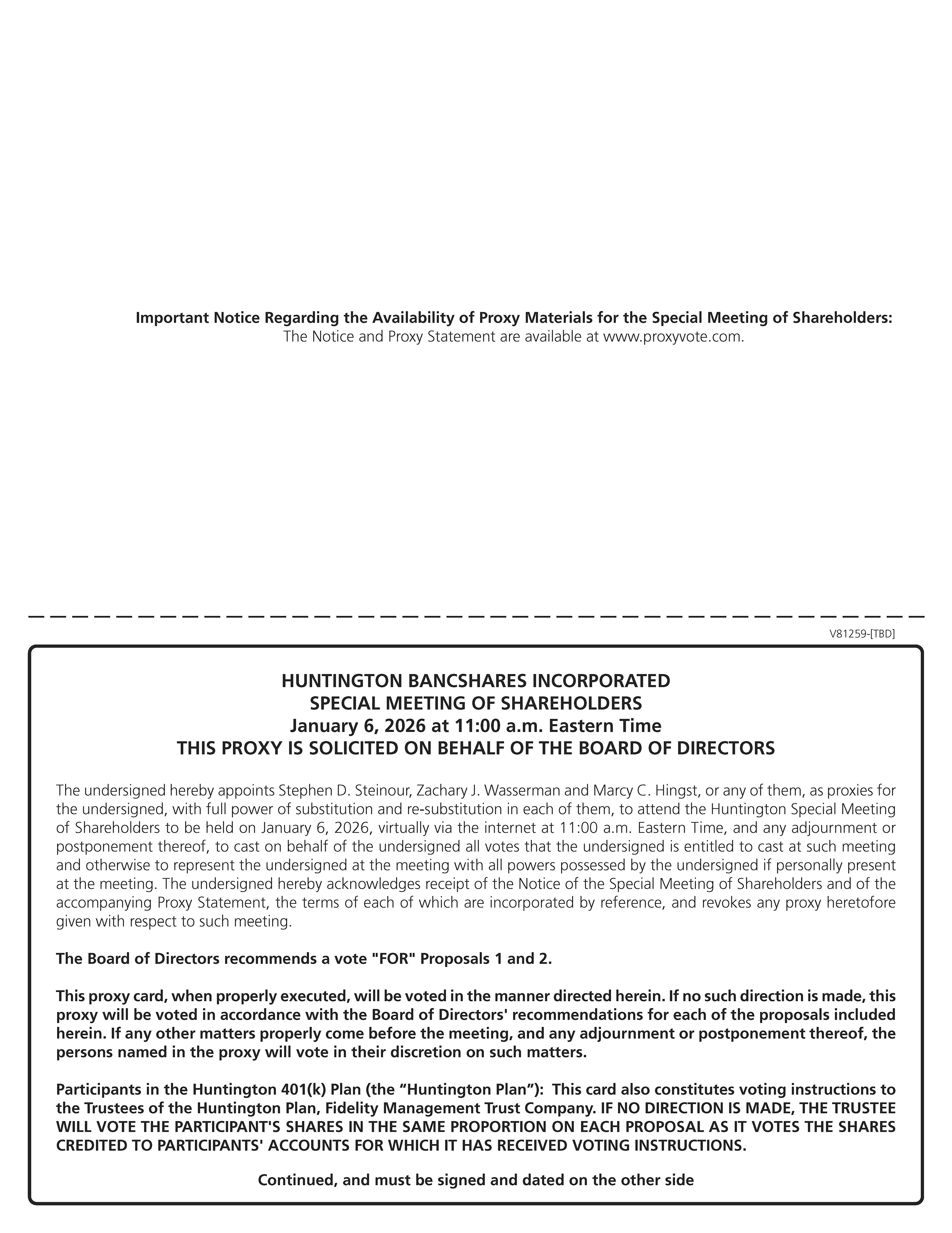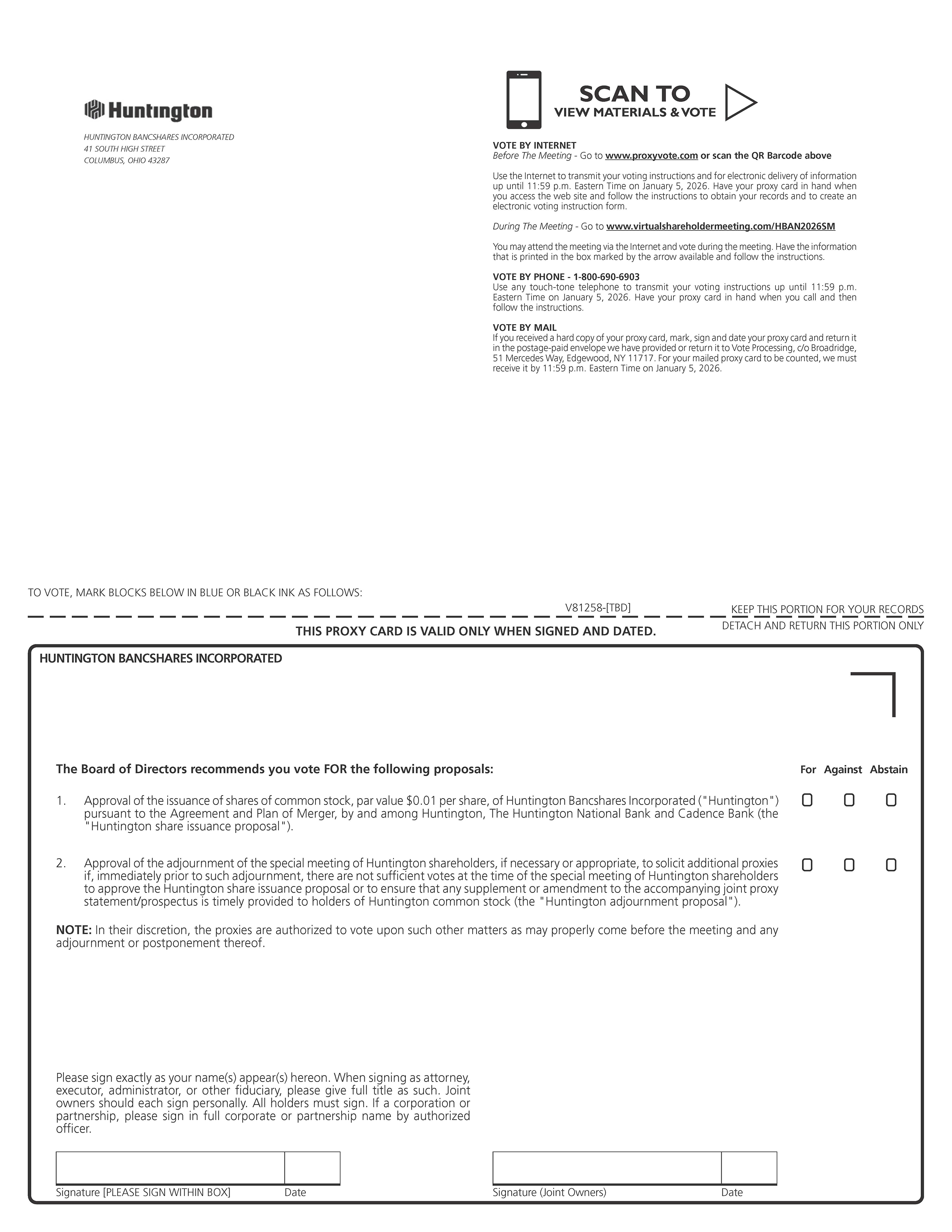 签名【请在框内签名】日期签名(共同所有人)投票日期,在下面用蓝色或黑色墨水标记方块如下:将此部分保留为您的记录DETACH并返回此部分仅此代理卡在签名并注明日期时有效。V81258-[待定] 1。根据亨廷顿银行、亨廷顿国家银行和Cadence Bank之间的合并协议和计划(“亨廷顿股票发行提案”),批准亨廷顿银行(“亨廷顿”)发行每股面值0.01美元的普通股。2.批准亨廷顿股东特别会议休会(如有必要或适当)以征集额外代理人,前提是在紧接该休会前,亨廷顿股东特别会议召开时没有足够票数批准亨廷顿股票发行提案或确保及时向亨廷顿普通股持有人提供对所附联合代理声明/招股说明书的任何补充或修订(“亨廷顿休会提案”)。For against abstain!!!!!!请与您在此出现的姓名一模一样签名。以律师、被执行人、管理人、其他受托人身份签字时,请按此提供全称。共同所有人应各自亲自签字。所有持有人必须签字。如属法团或合伙企业,请获授权人员签署完整的法团或合伙名称。注:各代理人有权酌情就会议之前可能适当提出的其他事项及其任何休会或延期进行表决。HUNTINGTON BANCSHARES INCORPORATED董事会建议您投票支持以下提案:HUNTINGTON BANCSHARES INCORPORATED 41 SOUTH High STREET COLUMBUS,OHIO 43287会议前通过互联网投票-访问www.proxyvote.com或扫描上面的二维码使用互联网传输您的投票指示,并在2026年1月5日东部时间晚上11:59之前以电子方式传递信息。当您访问网站并按照指示获取您的记录和创建电子投票指示表时,请准备好您的代理卡。会议期间-请访问www.virtualshareholdermeeting.com/HBAN2026SM您可以通过互联网参加会议,并在会议期间进行投票。拥有箭头标记的框中打印的信息可用,并按照说明进行操作。电话投票-1-800-690-6903使用任何按键式电话传送您的投票指示,直至美国东部时间2026年1月5日晚上11:59。打电话时要准备好代理卡,然后按照指示操作。邮寄投票如果您收到了您的代理卡的硬拷贝,请在您的代理卡上做标记、签名并注明日期,并将其放入我们提供的已付邮资的信封中退回,或退回给Vote Processing,c/o Broadridge,51 Mercedes Way,Edgewood,NY 11717。为了让您邮寄的代理卡被清点,我们必须在美国东部时间2026年1月5日晚上11:59之前收到。扫描查看材料&投票
