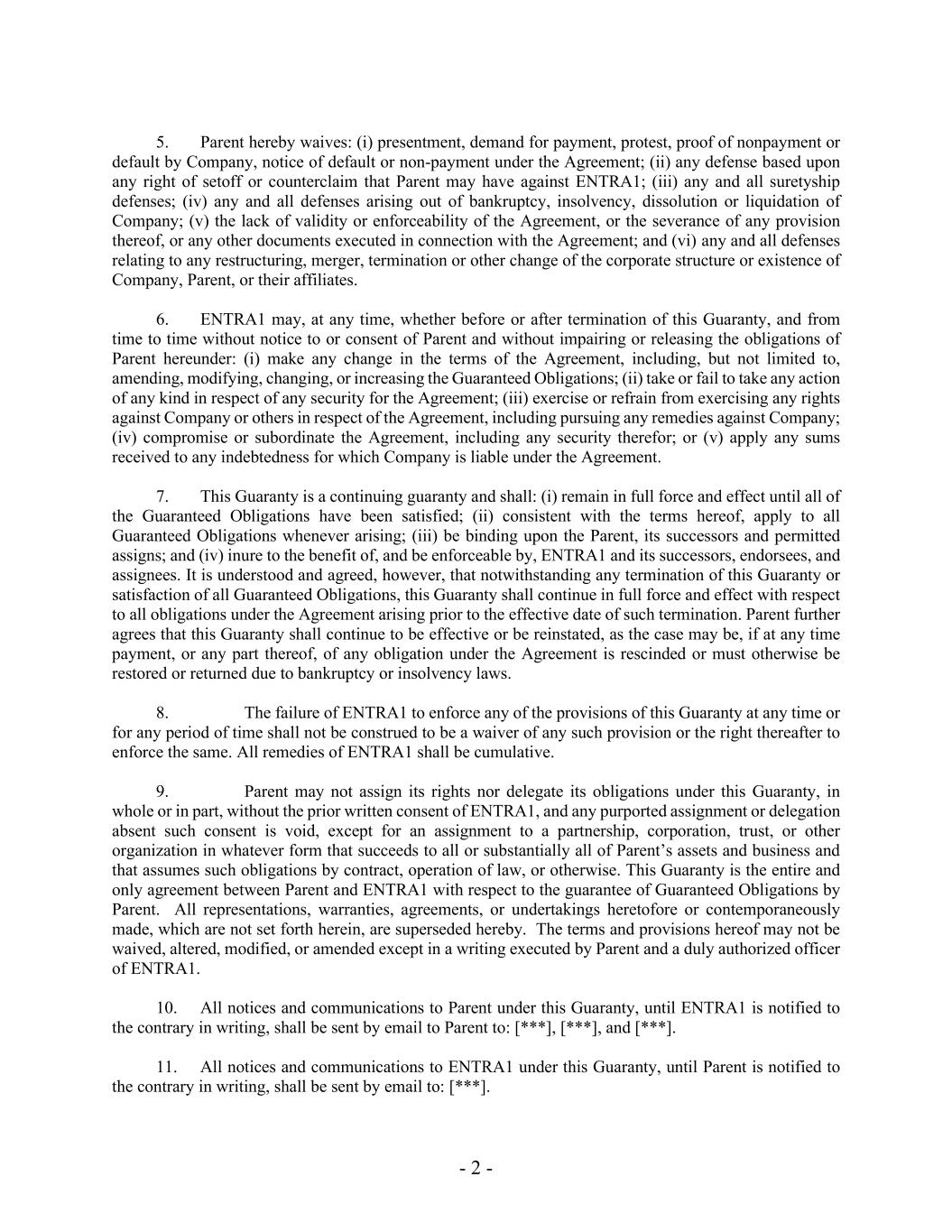 - 2 - 5.母公司特此放弃:(i)出示、要求付款、抗诉、公司未付款或违约的证明、违约或未根据协议付款的通知;(ii)基于母公司可能对ENTRA1拥有的任何抵销权或反索赔的任何抗辩;(iii)任何和所有担保抗辩;(iv)因公司破产、无力偿债、解散或清算而产生的任何和所有抗辩;(v)协议缺乏有效性或可执行性,或其中任何条款被终止,或就本协议签立的任何其他文件;及(vi)与公司架构或公司、母公司或其联属公司的存在的任何重组、合并、终止或其他变更有关的任何及所有抗辩。6.EnTRA1可在任何时间,不论是在本担保终止之前或之后,并不时在不通知或不征得母公司同意的情况下,在不损害或解除母公司在本协议项下的义务的情况下:(i)对协议条款作出任何变更,包括但不限于修订、修改、更改或增加所担保的义务;(ii)就协议的任何担保采取或不采取任何种类的行动;(iii)就协议行使或不行使针对公司或其他人的任何权利,包括对公司采取任何补救措施;(iv)妥协或从属于协议,包括为其提供任何担保;或(v)将收到的任何款项用于公司根据协议承担责任的任何债务。7.本担保为持续担保,应:(i)保持完全有效,直至所有担保义务均已履行完毕;(ii)与本协议条款一致,适用于所有担保义务,无论何时发生;(iii)对母公司、其继承人和允许的受让人具有约束力;(iv)符合ENTRA1及其继承人、被背书人和受让人的利益,并可由其强制执行。但据了解并同意,尽管本担保有任何终止或所有被担保义务的清偿,本担保应继续对该终止生效日期之前产生的协议项下的所有义务具有完全效力和效力。母公司还同意,如果在任何时候,由于破产法或破产法,协议项下任何义务的付款或其任何部分被撤销或必须以其他方式恢复或返还,则本担保应继续有效或恢复(视情况而定)。8.ENTRA1未能在任何时间或任何期间强制执行本担保的任何规定,不得解释为放弃任何该等规定或其后强制执行该等规定的权利。EnTRA1的所有补救措施应是累积性的。9.未经ENTRA1事先书面同意,母公司不得全部或部分转让其在本担保项下的权利或转让其义务,任何声称未经此类同意的转让或转让均为无效,但以任何形式转让给合伙企业、公司、信托或其他组织的、继承母公司全部或基本全部资产和业务并通过合同、法律运作或其他方式承担此类义务的转让除外。本担保是父母与ENTRA1之间关于父母担保担保义务的全部且唯一的协议。在此之前或同时作出的所有陈述、保证、协议或承诺,凡未在此阐述的,在此被取代。本协议的条款和规定不得放弃、更改、修改或修改,除非由家长和ENTRA1的正式授权人员签署书面文件。10.本担保项下所有致家长的通知及通讯,直至ENTRA1收到相反的书面通知前,应以电子邮件方式发送至家长:[***], [***],以及[***].11.本担保项下对ENTRA1的所有通知和通信,在收到相反书面通知前,应通过电子邮件发送至:【***].