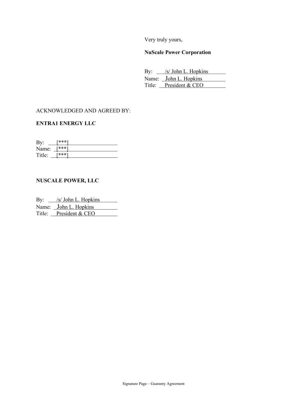 Signature page – Guaranty Agreement Very true yours,NuScale Power Corporation by:/s/John L. Hopkins Name:John L. Hopkins title:总裁兼首席执行官确认并同意by:EntRA1 ENERGY LLC by:[***]姓名:[***】标题:[***] NUSCALE POWER,LLC by:/s/John L. Hopkins Name:John L. Hopkins Title:President & CEO