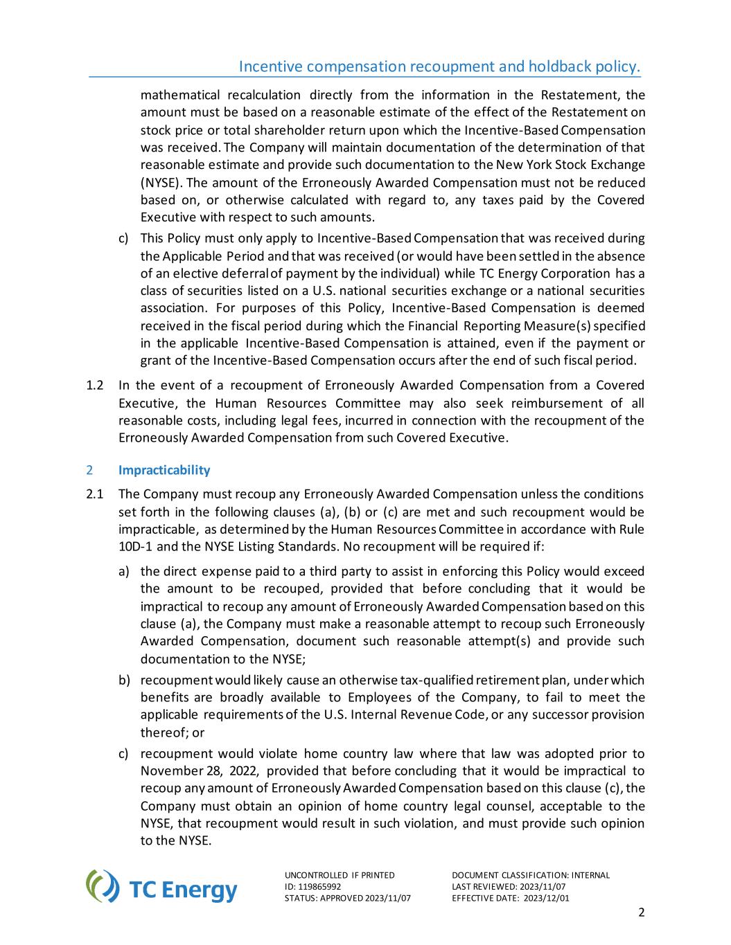 激励补偿补偿和保留政策。不受控制的如果打印文件分类:内部编号:119865992最后审核:2023/11/07状态:批准2023/11/07生效日期:2023/12/012直接从重述中的信息进行数学重新计算,金额必须基于对重述对股价或收到基于激励的薪酬的股东总回报的影响的合理估计。公司将保留确定该合理估计的文件,并向纽约证券交易所(NYSE)提供此类文件。错误授予的补偿金额不得根据或以其他方式计算所涵盖的高管就此类金额支付的任何税款而减少。c)本政策必须仅适用于在适用期间内收到的基于激励的补偿,并且在TC Energy Corporation拥有在美国国家证券交易所或国家证券协会上市的一类证券时收到的(或在个人没有选择性延期付款的情况下本应得到解决)。就本政策而言,基于激励的薪酬被视为在获得适用的基于激励的薪酬中规定的财务报告措施的财政期内收到,即使基于激励的薪酬的支付或授予发生在该财政期结束后。1.2如果从受保高管处收回错误授予的薪酬,人力资源委员会还可以要求从该受保高管处报销与补偿错误授予的薪酬有关的所有合理费用,包括法律费用。2不可行2.1公司必须收回任何错误授予的补偿,除非符合以下(a)、(b)或(c)条规定的条件,并且人力资源委员会根据规则10D-1和纽约证券交易所上市标准确定的这种补偿将不可行。在以下情况下,无需进行补偿:a)支付给第三方以协助执行本保单的直接费用将超过应补偿的金额,前提是在得出根据本条款(a)收回任何金额的错误授予的补偿是不切实际的结论之前,公司必须做出合理尝试以收回此类错误授予的补偿,记录此类合理尝试并向纽约证券交易所提供此类文件;b)补偿可能会导致其他符合税收条件的退休计划,根据该计划,公司员工可以广泛获得福利,未能满足美国《国内税收法》或其任何后续条款的适用要求;或c)在2022年11月28日之前通过该法律的情况下,补偿将违反母国法律,条件是在得出根据该条款(c)收回任何金额的错误授予的补偿不切实际的结论之前,公司必须获得母国法律顾问的意见,该意见为纽约证券交易所所接受,即补偿将导致此类违规行为,并且必须向纽约证券交易所提供该意见。