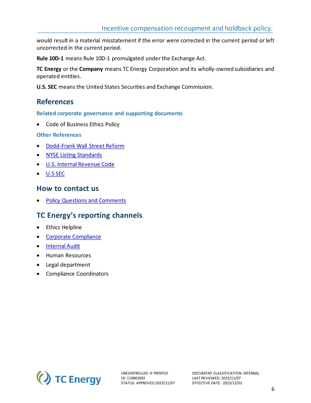 激励补偿补偿和保留政策。若印刷单证分类不受控制:内部编号:119865992最后审阅:2023/11/07状态:核准2023/11/07生效日期:2023/12/016若当期更正或当期未更正,将导致重大错报。规则10D-1是指根据《交易法》颁布的规则10D-1。TC Energy或本公司指TC Energy Corporation及其全资子公司、经营实体。美国证券交易委员会是指美国证券交易委员会。参考资料相关公司治理及配套文件•商业道德准则政策其他参考资料•多德-弗兰克华尔街改革•纽交所上市标准•美国国内税收法规•美国SEC如何联系我们•政策问题与评论TC Energy的报告渠道•道德帮助热线•公司合规•内部审计•人力资源•法律部门•合规协调员