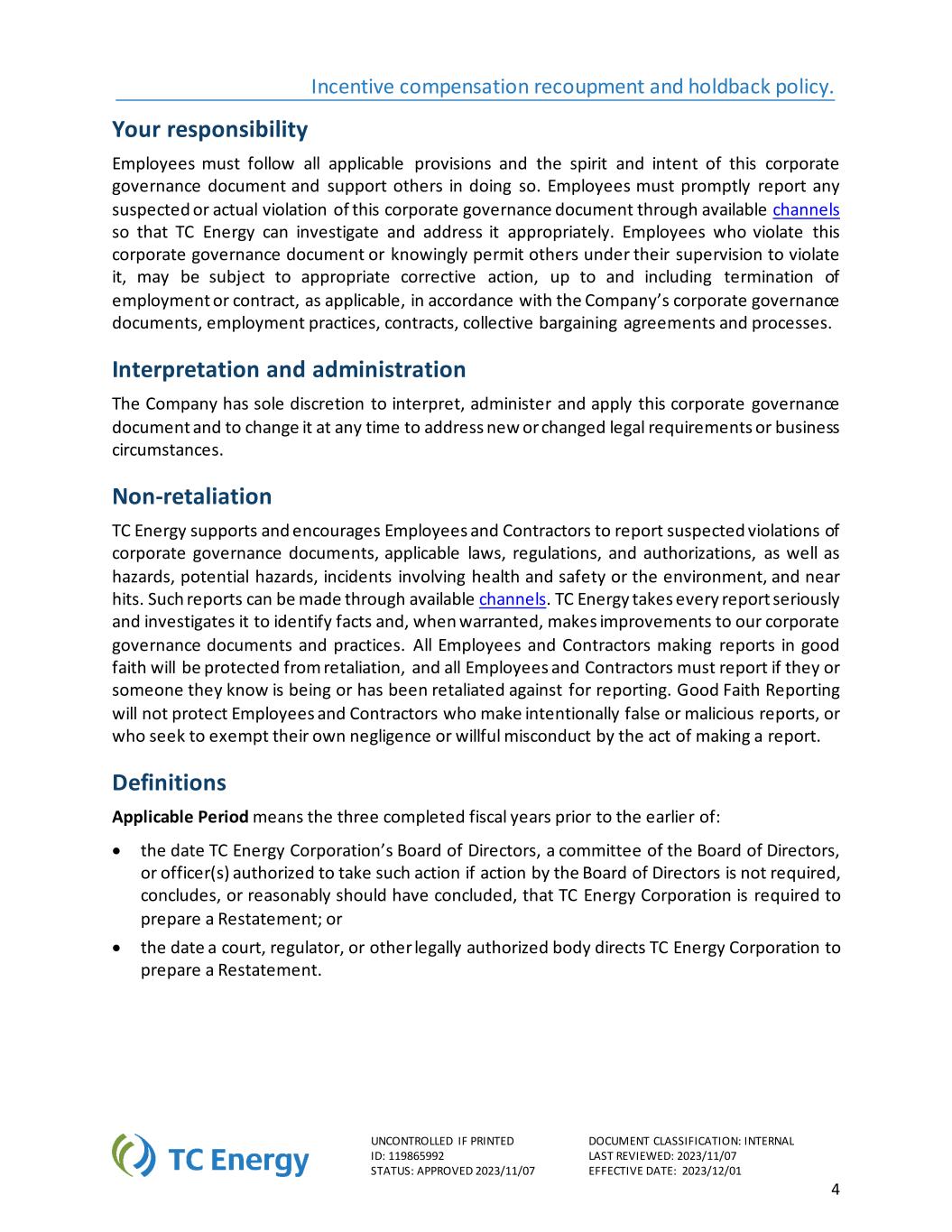 激励补偿补偿和保留政策。如果打印文件分类:内部编号:119865992最后审核:2023/11/07状态:批准2023/11/07生效日期:2023/12/014您的责任员工必须遵守所有适用条款以及本公司治理文件的精神和意图,并支持他人这样做。员工必须通过可利用的渠道及时报告任何涉嫌或实际违反本公司治理文件的行为,以便TC Energy进行调查并妥善处理。员工违反本公司治理文件或明知而允许其监督下的其他人违反本公司治理文件,可能会根据公司的公司治理文件、雇佣惯例、合同、集体谈判协议和流程,受到适当的纠正行动,直至并包括终止雇佣或合同(如适用)。解释及行政本公司全权酌情解释、管理及适用本企业管治文件,并随时更改该文件,以应对新的或变更的法律规定或业务情况。不报复TC Energy支持和鼓励员工和承包商报告涉嫌违反公司治理文件、适用的法律、法规和授权,以及危害、潜在危险、涉及健康和安全或环境的事件以及就近命中的行为。此类报告可通过现有渠道进行。TC Energy认真对待每份报告并对其进行调查以识别事实,并在必要时对我们的公司治理文件和实践进行改进。所有善意举报的员工和承包商都将受到保护,不受报复,如果他们或他们认识的人正在或已经因举报而受到报复,所有员工和承包商都必须进行举报。善意报告不会保护故意作出虚假或恶意报告的员工和承包商,或寻求通过作出报告的行为免除自己的疏忽或故意不当行为的员工和承包商。定义适用期间是指以下两者中较早者之前的三个已完成的财政年度:• TC Energy Corporation董事会、董事会委员会或获授权采取此类行动的高级职员(如果董事会的行动不需要、得出结论或合理地应该得出结论,即TC Energy Corporation被要求准备重述;或•法院、监管机构或其他合法授权机构指示TC Energy Corporation准备重述的日期,以较早者为准。