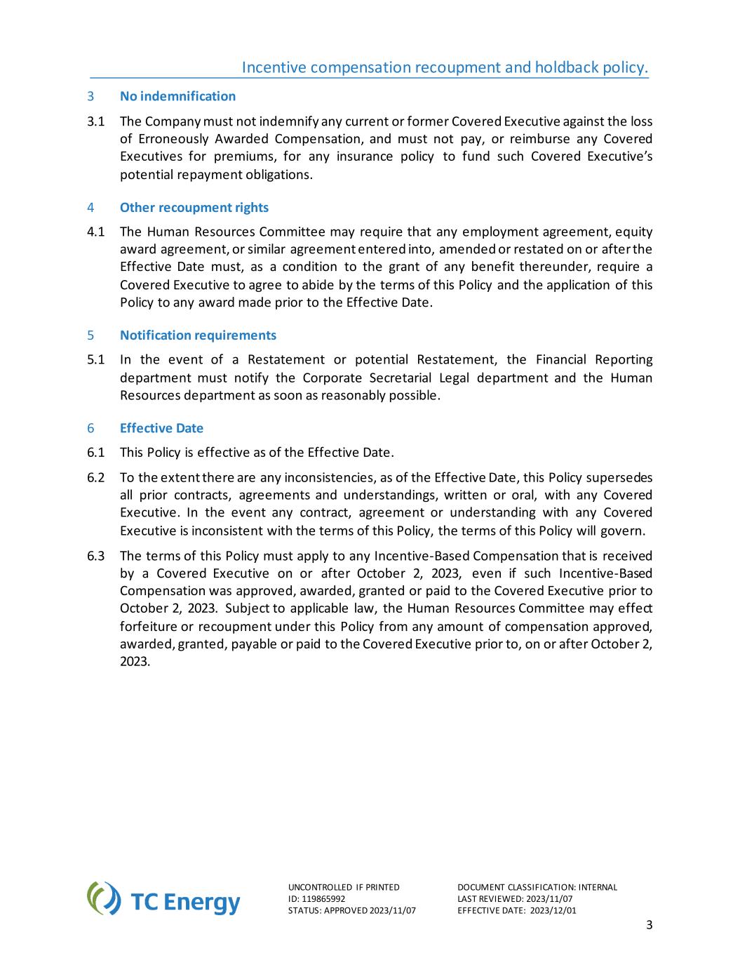激励补偿补偿和保留政策。如果印刷文件分类不受控制:内部编号:119865992最后审查:2023/11/07状态:批准2023/11/07生效日期:2023/12/015除前一句所述的最近三个已完成的会计年度外,适用期间包括在这三个已完成的会计年度内或紧接其后的任何过渡期(由于TC Energy Corporation的会计年度发生变化而导致的);但是,前提是,TC Energy Corporation上一个财政年度结束的最后一天与其新的财政年度的第一天之间的过渡期,为期9个月至12个月,就适用期间而言,该过渡期将被视为已完成的财政年度。涵盖的执行官是指根据人力资源委员会根据上市标准和规则10D-1以及规则10D-1(d)中定义的执行官定义确定的所有TC Energy Corporation现任和前任执行官。生效日期指2023年12月1日。雇员是指公司的全职、兼职、临时和学生雇员。错误授予补偿是指覆盖的高管收到的基于激励的补偿金额,超过了如果根据重述确定本应收到的基于激励的补偿金额。《交易法》是指经修订的1934年美国证券交易法。财务报告措施是指根据编制TC Energy Corporation财务报表时使用的会计原则确定和列报的措施,以及全部或部分源自该等措施的任何措施,包括股价和股东总回报。诚信举报,就是公开、诚实、公正、合理的举报,没有恶意,也没有别有用心。人力资源委员会指TC Energy Corporation董事会的人力资源委员会。基于激励的薪酬是指全部或部分基于实现财务报告措施而授予、赚取或归属的公司所有薪酬,例如现金奖金或其他现金激励奖励(包括其任何递延要素),以及已归属和未归属的股权奖励(包括期权、限制性股票和限制性股票单位、绩效股票单位奖励和绩效股票奖励)。为免生疑问,基于激励的薪酬不包括年薪、基于完成特定服务期而授予的薪酬,或基于主观标准、战略措施或运营措施而授予的薪酬,除非也基于达到财务报告措施。纽交所上市标准是指《纽约证券交易所上市公司手册》第303A.14节。重述是指由于重大不遵守美国联邦证券法下的任何财务报告要求,包括为更正先前发布的财务报表中对先前发布的财务报表具有重大意义的错误而进行的任何必要的会计重述,或者由于