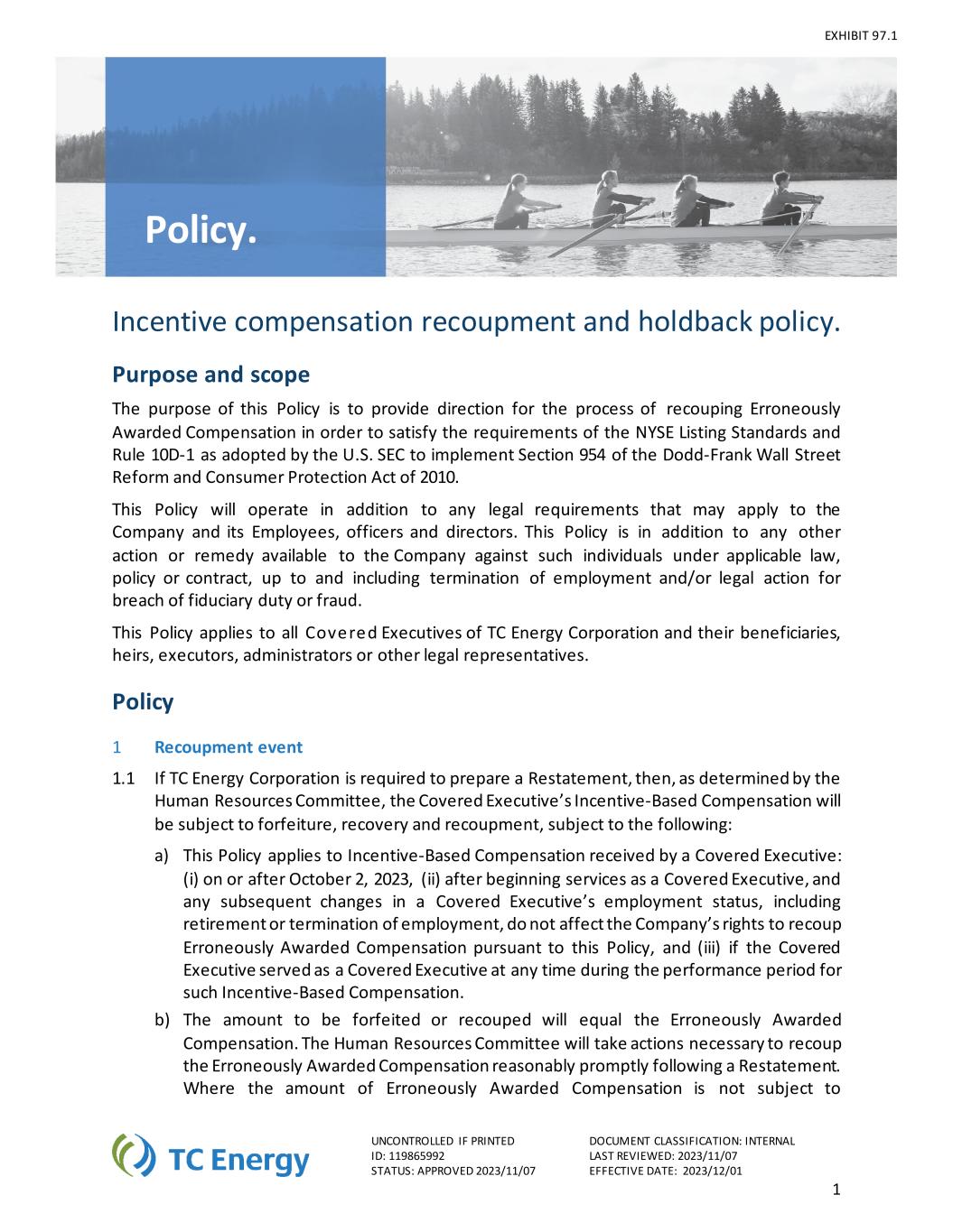不受控制如果打印文件分类:内部编号:119865992最后审查:2023/11/07状态:批准2023/11/07生效日期:2023/12/011政策。EXHIBIT 97.1激励补偿补偿和保留政策。目的和范围本政策的目的是为追回错误授予的赔偿的过程提供方向,以满足美国SEC为实施2010年《多德-弗兰克华尔街改革和消费者保护法》第954条而采用的纽交所上市标准和规则10D-1的要求。除可能适用于公司及其雇员、高级职员和董事的任何法律要求外,本政策还将实施。本政策是公司根据适用法律、政策或合同对这些个人可采取的任何其他行动或补救措施的补充,直至并包括终止雇佣和/或因违反信托义务或欺诈而采取的法律行动。本政策适用于TC Energy Corporation的所有覆盖高管及其受益人、继承人、被执行人、管理人或其他法定代表人。政策1补偿事件1.1如果TC Energy Corporation被要求准备重述,那么,根据人力资源委员会的决定,所涵盖的高管基于激励的薪酬将被没收、追回和补偿,但须遵守以下规定:a)本政策适用于所涵盖的高管收到的基于激励的薪酬:(i)在2023年10月2日或之后,(ii)在开始作为所涵盖的高管提供服务之后,以及所涵盖的高管雇佣状态的任何后续变化,包括退休或终止雇佣,均不影响公司根据本政策收回错误奖励的薪酬的权利,及(iii)如受保行政人员在业绩期间的任何时间担任受保行政人员,以获得该等基于奖励的薪酬。b)将被没收或收回的金额将等于错误授予的薪酬。人力资源委员会将采取必要行动,在重述后合理及时地收回错误授予的薪酬。误判赔偿金额不受
