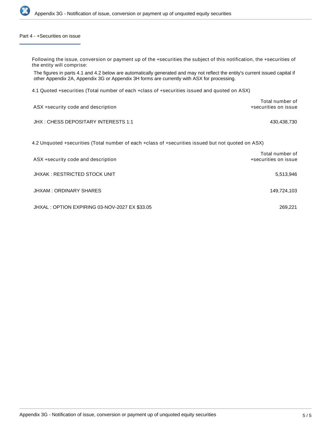 附录3G-未上市股本证券的发行、转换或缴款通知附录3G-未上市股本证券的发行、转换或缴款通知5/5第4部分-+已发行证券在本通知标的的+证券发行、转换或缴款后,实体的+证券将包括:下文第4.1和4.2部分中的数字是自动生成的,如果其他附录2A、附录3G或附录3H表格目前由ASX处理,则可能无法反映实体当前的已发行资本。4.1报价+证券(每类合计+在ASX发行和报价的+证券)ASX +证券代码及说明+已发行证券的合计数量JHX:CHESS Depositary Interests 1:1430,438,7304.2未报价+证券(每类合计+已发行但未在ASX报价的+证券)ASX +证券代码及说明已发行的+证券的合计数量JHXAK:限制性股票单位5,513,946 JHXAM:普通股149,724,103 JHXAL:期权将于2027年11月3日EX 33.05 269,221美元
