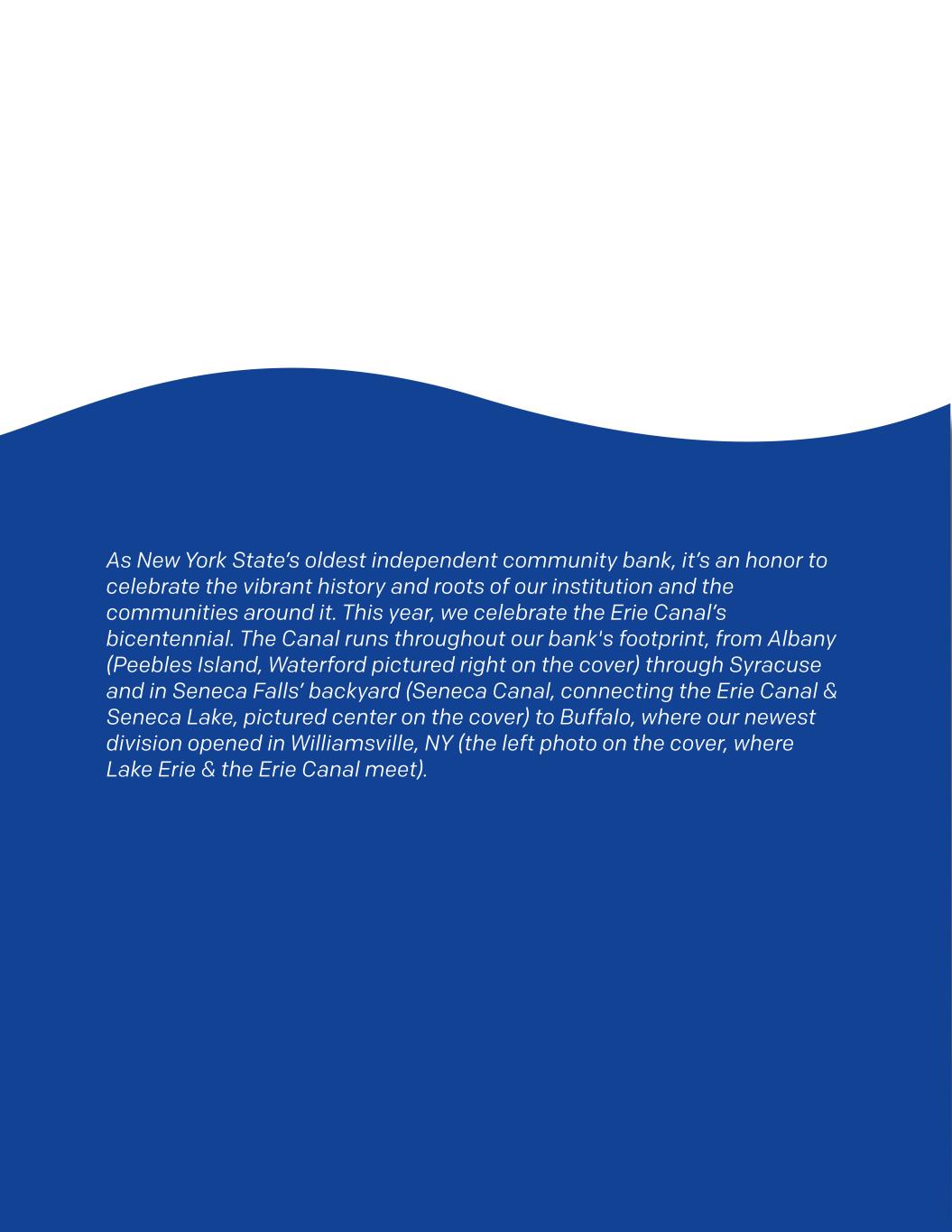 作为纽约州历史最悠久的独立社区银行,我们很荣幸能够庆祝我们机构及其周围社区充满活力的历史和根基。今年,我们庆祝伊利运河200周年。运河贯穿我们银行的足迹,从奥尔巴尼(皮布尔斯岛,封面右图为沃特福德)穿过锡拉丘兹和塞内卡瀑布的后院(塞内卡运河,连接伊利运河和塞内卡湖,封面上图为中心)到布法罗,我们最新的分部在纽约州威廉斯维尔开业(封面左图为伊利湖和伊利运河交汇的地方)。