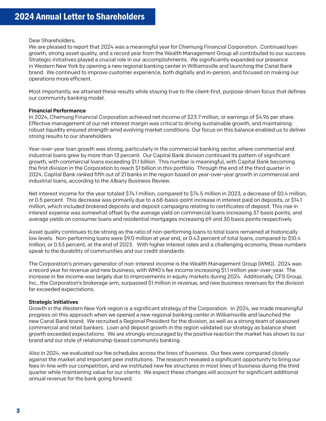 3尊敬的股东,我们很高兴地报告,对于Chemung Financial Corporation来说,2024年是有意义的一年。持续的贷款增长、强劲的资产质量以及财富管理集团创纪录的一年,都为我们的成功做出了贡献。战略举措在我们取得成就方面发挥了关键作用。我们通过在威廉斯维尔开设新的区域银行中心并推出Canal Bank品牌,显着扩大了我们在纽约西部的业务。我们继续通过数字化和面对面的方式改善客户体验,并专注于提高我们的运营效率。最重要的是,我们取得了这些成果,同时忠于客户至上、目标驱动的重点,这定义了我们的社区银行模式。2024年财务业绩,Chemung Financial Corporation实现净收入2370万美元,每股收益4.96美元。有效管理我们的净息差对于推动可持续增长至关重要,在不断变化的市场条件下,保持稳健的流动性确保了实力。我们对这种平衡的关注使我们能够为股东带来强劲的业绩。贷款同比增长强劲,尤其是在商业银行领域,商业和工业贷款增长超过13%。我们的Capital银行部门继续其显着增长的格局,商业贷款超过了11亿美元。这个数字很有意义,Capital银行成为该公司第一个在这个投资组合中达到10亿美元的部门。根据《奥尔巴尼商业评论》的数据,截至2024年第三季度末,根据2024年第三季度末,根据商业和工业贷款的同比增长,Capital银行在该地区21家银行中排名第五。该年度的净利息收入总计7410万美元,与2023年的7450万美元相比,减少了40万美元,或0.5%。这一减少主要是由于存款支付的利息增加了68个基点,即1410万美元,其中包括经纪存款和与存款证有关的存款活动。利息支出的这一上升在一定程度上被商业贷款平均收益率增加37个基点、消费者贷款和居民抵押贷款平均收益率分别增加69和30个基点所抵消。由于不良贷款占贷款总额的比率保持在历史低位,资产质量继续保持强劲。截至年底,不良贷款为900万美元,占贷款总额的0.43%,而2023年底为1040万美元,占贷款总额的0.53%。随着更高的利率和充满挑战的经济,这些数字说明了社区的持久性和我们的信用标准。该公司非利息收入的主要来源是财富管理集团(WMG)。2024年是营收和新业务创纪录的一年,WMG的手续费收入同比增加了110万美元。手续费收入的增长主要是由于2024年期间股票市场的改善。此外,该公司的经纪部门CFS Group,Inc.的收入超过了100万美元,该部门的新业务收入远超预期。战略举措纽约西部地区的增长是该公司的一项重要战略。2024年,我们在威廉斯维尔开设了一个新的区域银行中心,并推出了新的Canal Bank品牌,从而在这一方法上取得了有意义的进展。我们为该部门招聘了一位区域总裁,以及一支由经验丰富的商业和零售银行家组成的强大团队。由于资产负债表增长超出预期,该地区的贷款和存款增长验证了我们的战略。市场对我们的品牌和基于关系的社区银行风格表现出的积极反应令我们深受鼓舞。同样在2024年,我们评估了跨业务线的收费表。我们的收费与市场和重要的同行机构进行了密切的比较。研究揭示了一个重要的机会,可以使我们的费用与我们的竞争对手保持一致。我们在第三季度在大多数业务领域建立了新的费用结构,同时为我们的客户保持价值。我们预计,这些变化将为该行未来带来显着的额外年度收入。2024年度致股东的信