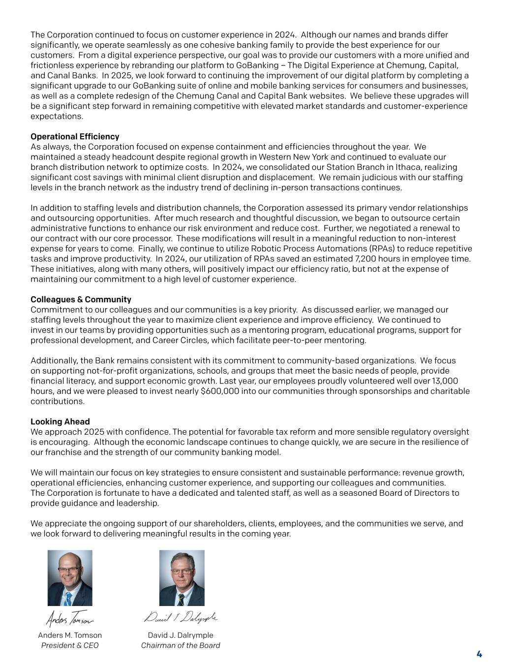 4公司在2024年继续专注于客户体验。尽管我们的名称和品牌差异很大,但我们作为一个有凝聚力的银行大家庭无缝运营,为我们的客户提供最佳体验。从数字体验的角度来看,我们的目标是通过将我们的平台更名为GoBanking —— Chemung、Capital和Canal Banks的数字体验,为我们的客户提供更加统一和无摩擦的体验。2025年,我们期待通过为消费者和企业完成对GoBanking在线和移动银行服务套件的重大升级,以及对Chemung Canal和Capital银行网站的完全重新设计,继续改进我们的数字平台。我们认为,这些升级将是在与更高的市场标准和客户体验预期保持竞争力方面向前迈出的重要一步。运营效率一如既往,公司全年专注于费用控制和效率。尽管纽约西部的区域增长,我们仍保持了稳定的员工人数,并继续评估我们的分支分销网络以优化成本。2024年,我们整合了位于伊萨卡的Station Branch,以最小的客户端中断和迁移实现了显着的成本节约。由于面对面交易下降的行业趋势仍在继续,我们对分支机构网络的人员配置水平保持审慎态度。除了人员配置水平和分销渠道外,该公司还评估了其主要供应商关系和外包机会。经过多方研究和深思熟虑的讨论,我们开始将某些行政职能外包,以增强我们的风险环境,降低成本。此外,我们与我们的核心处理器谈判续签了我们的合同。这些修改将导致未来几年非利息支出的显着减少。最后,我们继续利用机器人过程自动化(RPA)来减少重复性任务并提高生产力。2024年,我们利用RPA节省了大约7,200个小时的员工时间。这些举措,连同许多其他举措,将对我们的效率比率产生积极影响,但不会以维持我们对高水平客户体验的承诺为代价。同事和社区对我们的同事和社区的承诺是一个关键优先事项。正如前面所讨论的,我们全年都在管理我们的人员配置水平,以最大限度地提高客户体验并提高效率。我们继续通过提供指导计划、教育计划、职业发展支持和职业圈子等机会对我们的团队进行投资,这有助于同行之间的指导。此外,该银行仍与其对社区组织的承诺保持一致。我们重点支持满足人们基本需求、提供金融知识、支持经济增长的非营利组织、学校、团体。去年,我们的员工自豪地志愿服务了超过13,000小时,我们很高兴通过赞助和慈善捐款向我们的社区投资了近60万美元。展望未来,我们满怀信心地迎接2025年。有利的税收改革和更明智的监管监督的潜力令人鼓舞。尽管经济格局继续快速变化,但我们在特许经营的韧性和社区银行模式的实力方面是安全的。我们将保持对关键战略的关注,以确保业绩的一致性和可持续性:收入增长、运营效率、增强客户体验以及支持我们的同事和社区。公司有幸拥有尽职尽责、才华横溢的员工队伍,以及经验丰富的董事会提供指导和领导。我们感谢股东、客户、员工和我们所服务的社区的持续支持,我们期待在来年取得有意义的成果。Anders M. Tomson总裁兼首席执行官David J. Dalrymple董事会主席