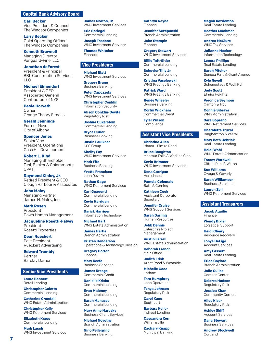 7 Carl Becker副总裁兼温莎家族企业法律顾问Larry Becker首席运营官The Windsor Companies Kenneth Brownell董事总经理Vanguard-Fine,LLC Jonathan deForest总裁兼首席执行官BBL Construction Services,LLC Michael Elmendorf总裁兼首席执行官NYS Associated General Contractors Paola Horvath所有者Orange Theory Fitness Gerald Jennings前奥尔巴尼市市长Spencer Jones运营高级副总裁Robert L. Kind管理股东Teal,Becker & Chiaramonte注册会计师Raymond Kinley,Jr.退休总裁兼首席执行官Clough Harbour & Associates John Maloy管理合伙人James H. Maloy,Inc. Mark Rosen总裁Dawn Homes Management Jacqueline Rosetti-Falvey总裁Rosetti Properties Dean Rueckert前任总裁Rueckert Advertising Edward Trombly合伙人Barclay Damon Laura Bennett零售贷款Christopher Coletta商业贷款Catherine Crandall WMG Estate Administration Christopher Kelly 丨WMG退休服务Elizabeth Kraus商业贷款Mark Lasch WMG Investment Services James Morton,IV WMG投资服务Eric Spriegel商业贷款Joseph Tascone WMGWMG投资服务Thomas Whitaker Finance Michael Blatt WMG Investment Services Gregory Bruno Business Banking Peter Capozzola WMG Investment Services Christopher Conklin Information Security Alison Conklin-Devita Regulatory Risk Joshua Cukerstein Commercial Lending Bryce Cutler Business Banking Justin Faulkner CFS Group Shelby Fay WMG Investment Services Mark Fife Business Banking Yvette Francisco Loan Review Nathan Gage TERM0退休服务Kari Guagenti Commercial Lending Kevin Harrigan Commercial Lending Darick Harriger Information Technology Michael Hart WMG Estate Administration James Hartle Branch Administration Kristen商业服务James Kresge 商业信贷 Danielle Krisko商业贷款Evan Maloney商业贷款Sarah Manasse商业贷款Mary Anne Narosky商业客户服务Michael Novotny分支机构管理局Nino Pellegrino商业银行Kathryn Rayne Finance Jennifer Sczepanski分支机构管理局John Stempin Finance Gregory Stewart ↓ WMG 丨WMG投资服务Billie Taft-Sitler商业贷款Schuyler Tilly Jr.商业贷款Kristina Vaselewski丨WMG WMG丨Prestige Banking Ren é e Wheeler商业银行业务Cortni Wickham 商业信贷丨Tyler Wilson Compliance Christina Allen Ithaca-Elmira Road Bruce Boughton Montour Falls & Watkins Glen Kevin Brimmer丨WMGColomaio Bath & 康宁 Kathleen Cook公司助理秘书Jennifer Cruise WMG支持服务Sarah Darling人力资源Jebb Dennis企业项目管理Austin Farrell WMG Estate Administration Deborah French Main Office Judith Frisk Arnot Road & Westside Michelle Goca Latham Tara Humphrey贷款操作Tonya Johnson监管风险Carol Kane Southport Barbara Keller间接贷款Cassandra Kerr Williamsville Zachary Knapp市政银行Megan Kozdemba房地产贷款Heather Machmer商业贷款Andrea McClure TERM0 Tax Services Julianne Meeker Information Technology Lenora Phillips Real Estate Lending Sarah Pitcher Seneca Falls & Grant Avenue Kyle Reyell Schenectady & Wolf RdJody Scott Elmira Heights Veronica Seymour Canton & Troy Connie Sibrava WMG Administration Sara Soprano WMG Retirement Services Charolette Truxal Binghamton & Vestal Mary Beth Uebrick Real Estate Lending Heidi Wahl WMG Estate Administration Tracey Wardwell Clifton Park & Wilton Sue 威廉姆斯TERM3 Owego & Waverly Sarah Williamson Business Services Lauren Zell WMG Retirement Services Jacob Aquilio Finance Wendy Bixler Logistical Support Heidi Cleary Resource Recovery Tonya DeLige Account Services Amy Fassett Real Estate Lending Erica Gaylord Branch AdministrationStewart Business Services Andrew Stockwell Cortland高级副总裁副总裁助理副总裁助理财务主管Capital银行顾问委员会